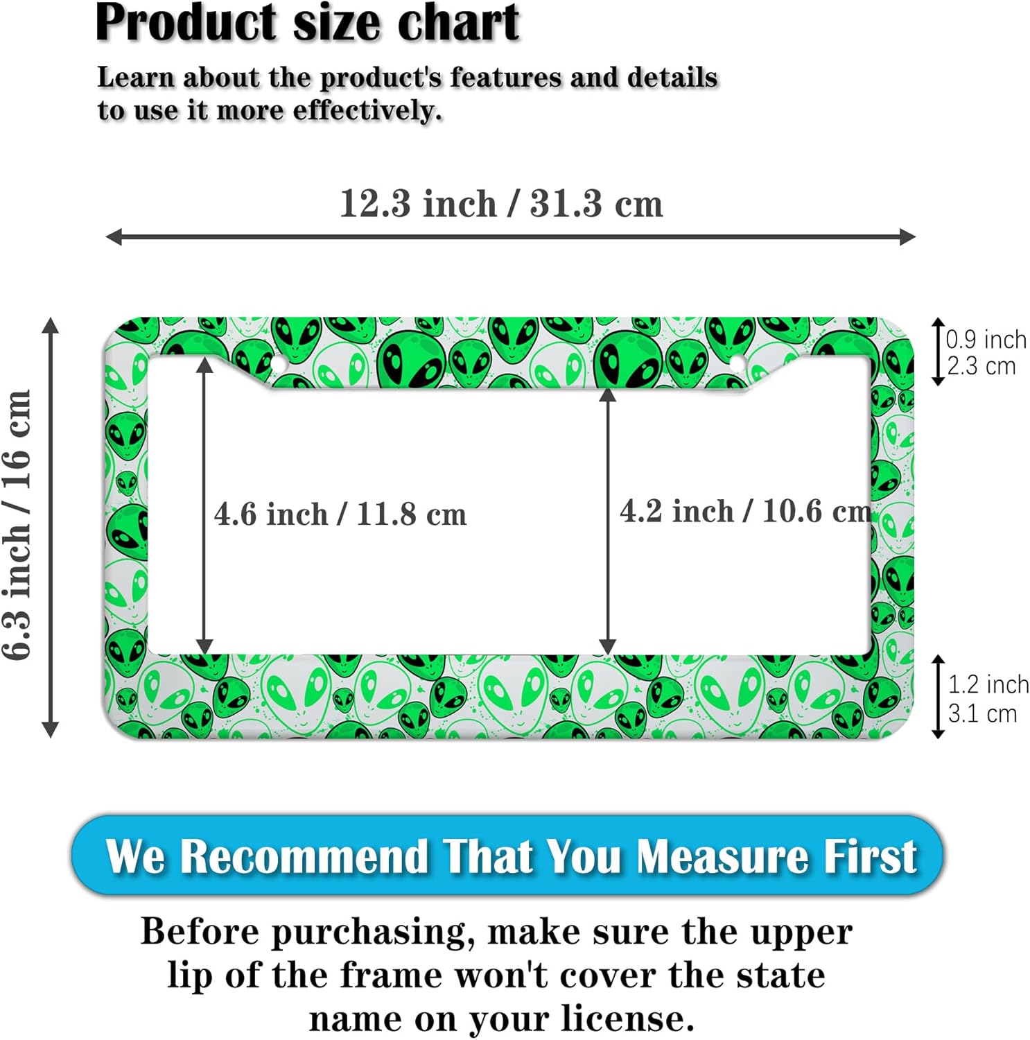 - STANDARD FRAME SIZE: Ensure a perfect fit by checking the dimensions to avoid covering your state name. These frames are specifically designed to fit standard American license plates measuring approximately 12.3" x 6.3" (16 x 31 cm). for most license plates in the U.S.