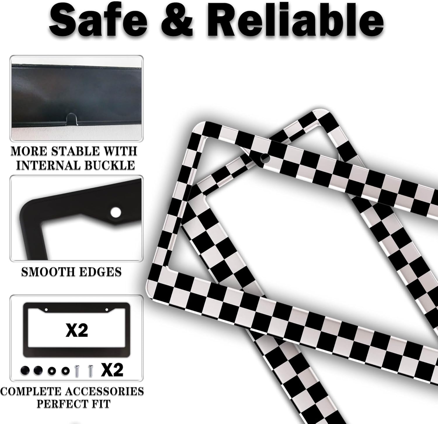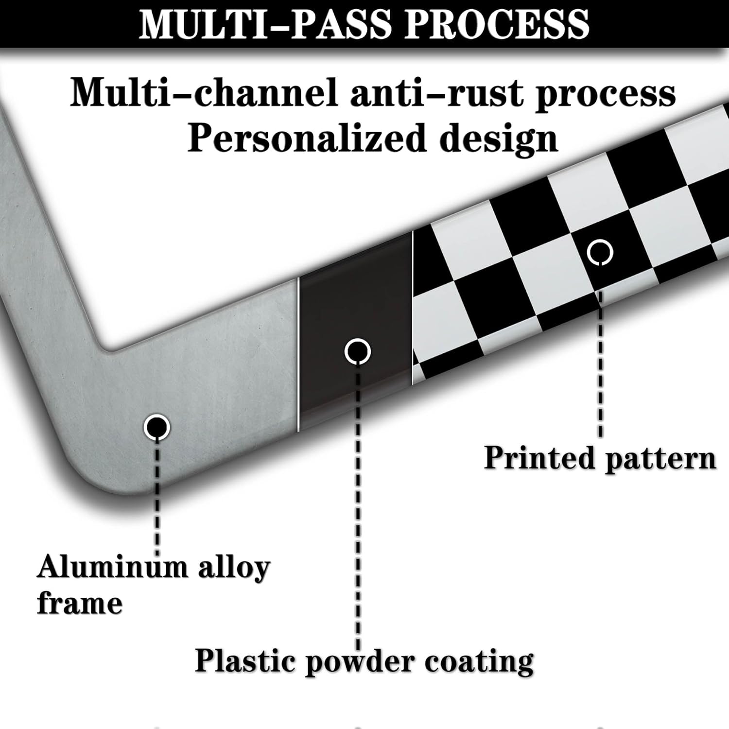 License Plate Frames Black and White License Plate Bracket Black and White Checkerboard Universal Aluminum Car Accessory 2 Pack with Screw Covers Set