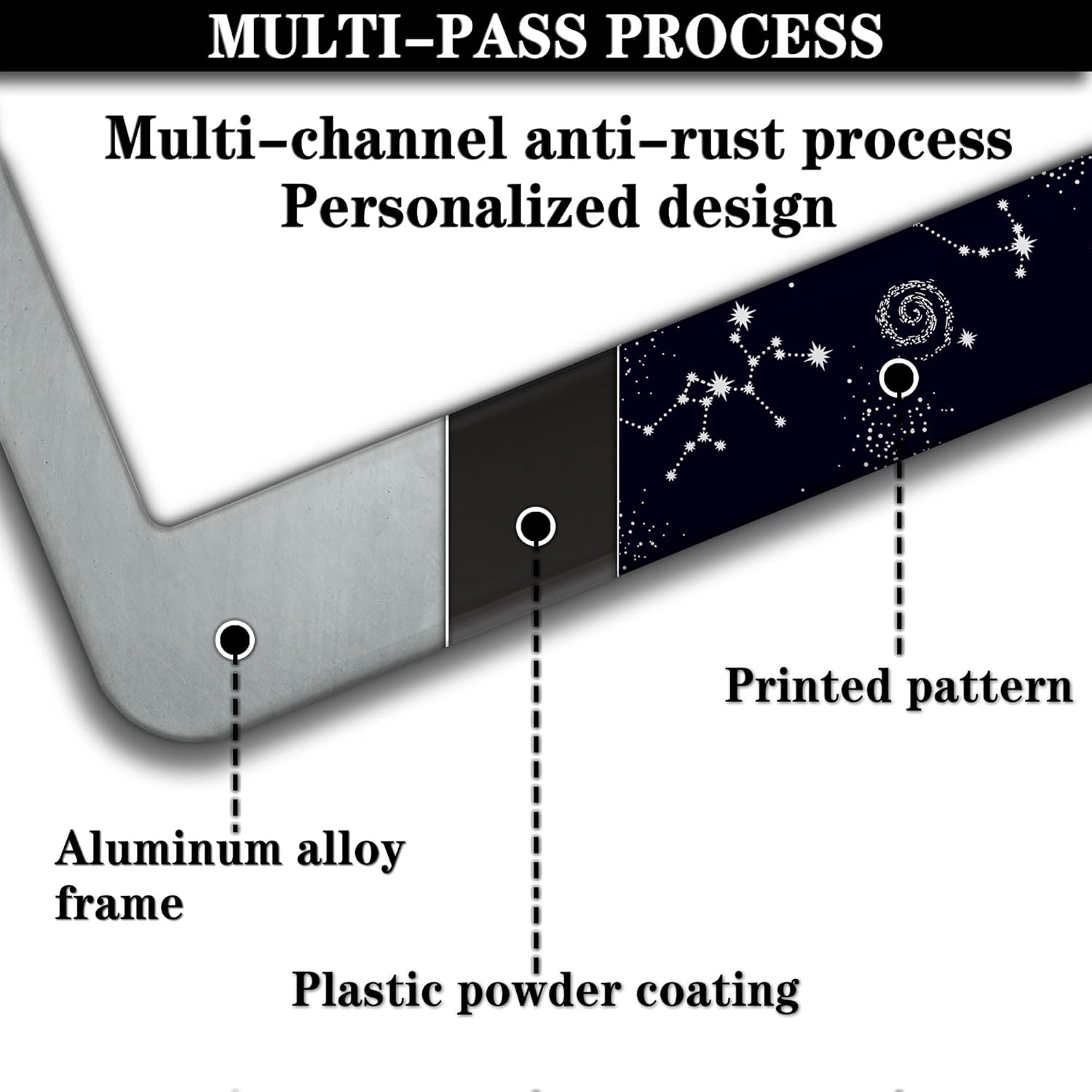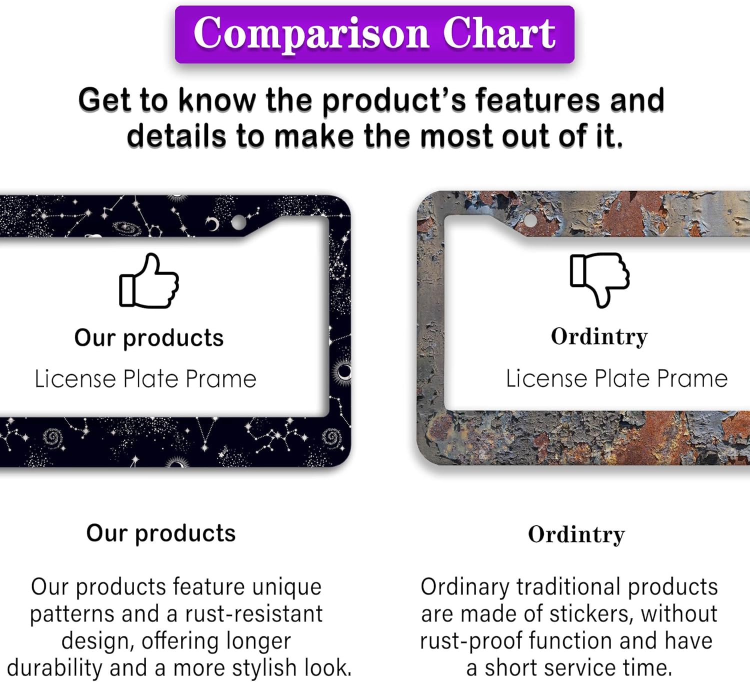 - ALUMINUM FRAME: This License Plate Frame is crafted from high-quality aluminum that is resistant to corrosion, rust, and harsh weather conditions. Its rugged reliability design ensures a long lifespan, making it capable of withstanding car washes and extreme weather, providing you with a reliable and stylish solution for your vehicle.