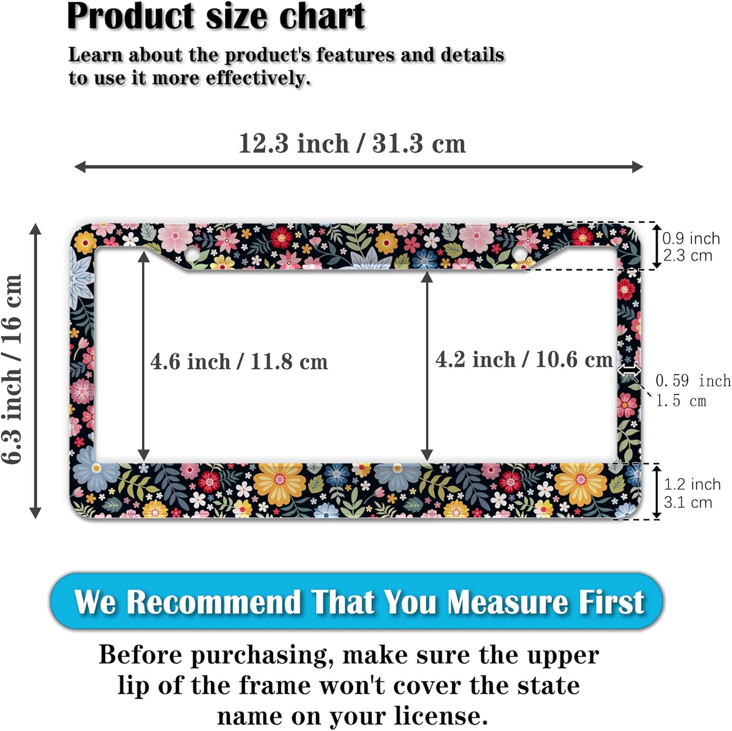 - STANDARD FRAME SIZE: Ensure a perfect fit by checking the dimensions to avoid covering your state name. These frames are specifically designed to fit standard American license plates measuring approximately 12.3" x 6.3" (16 x 31 cm). for most license plates in the U.S.