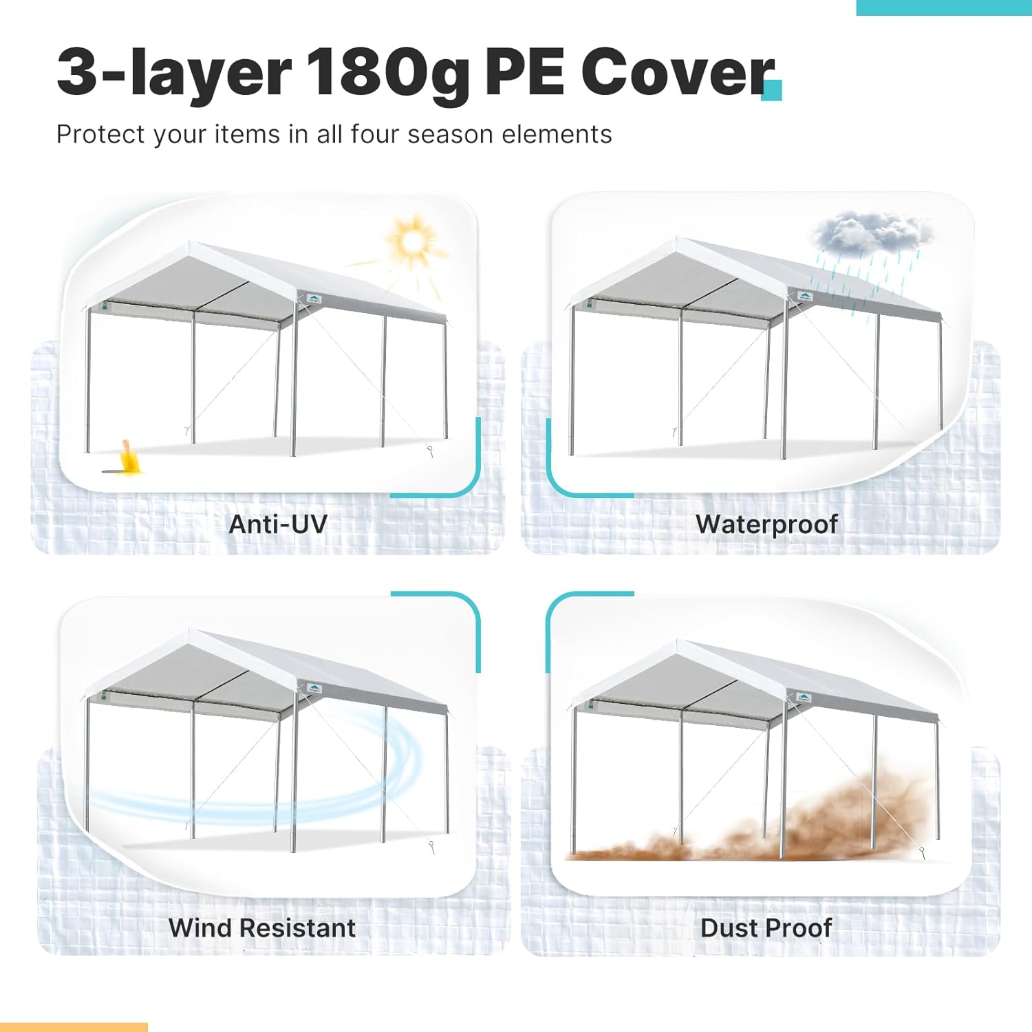 - 【Waterproof Canopy Cover】- This carport is made of heat-sealed, triple-layer 180g polyethylene fabric, which is Anti-UV, Waterproof, and can protect your car or boat against all four seasons elements, like sun, wind, rain, dust, hail, and snow.