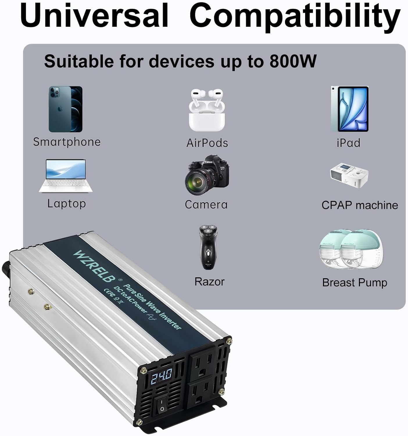 - 【Pure Sine Wave Power Inverter】provides 800 watt true pure sine wave DC 24volt to AC 120volt continuous power, high quality and stable output power ,60HZ ,single phase, high frequency,Ideal for sensitive loads appliances under 800Watt,like Tvs,Laptops,phones, CPAP and various household appliances
