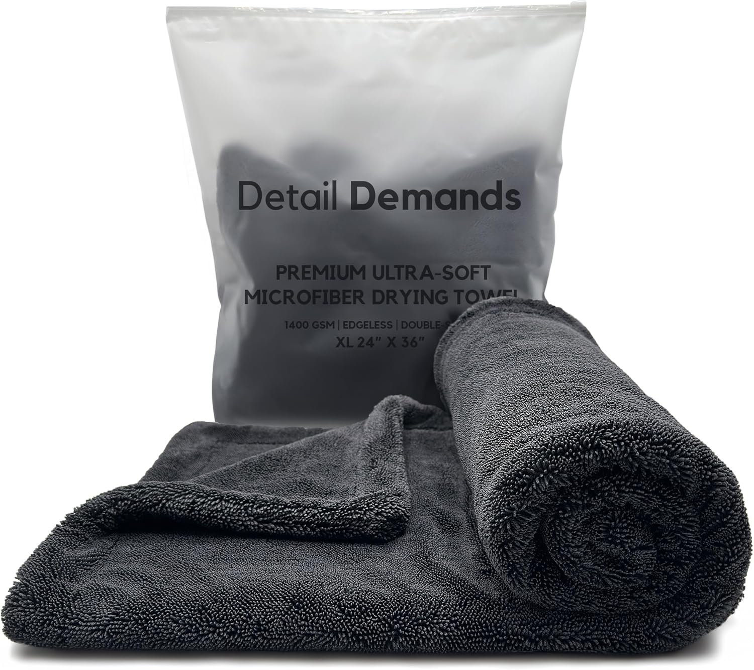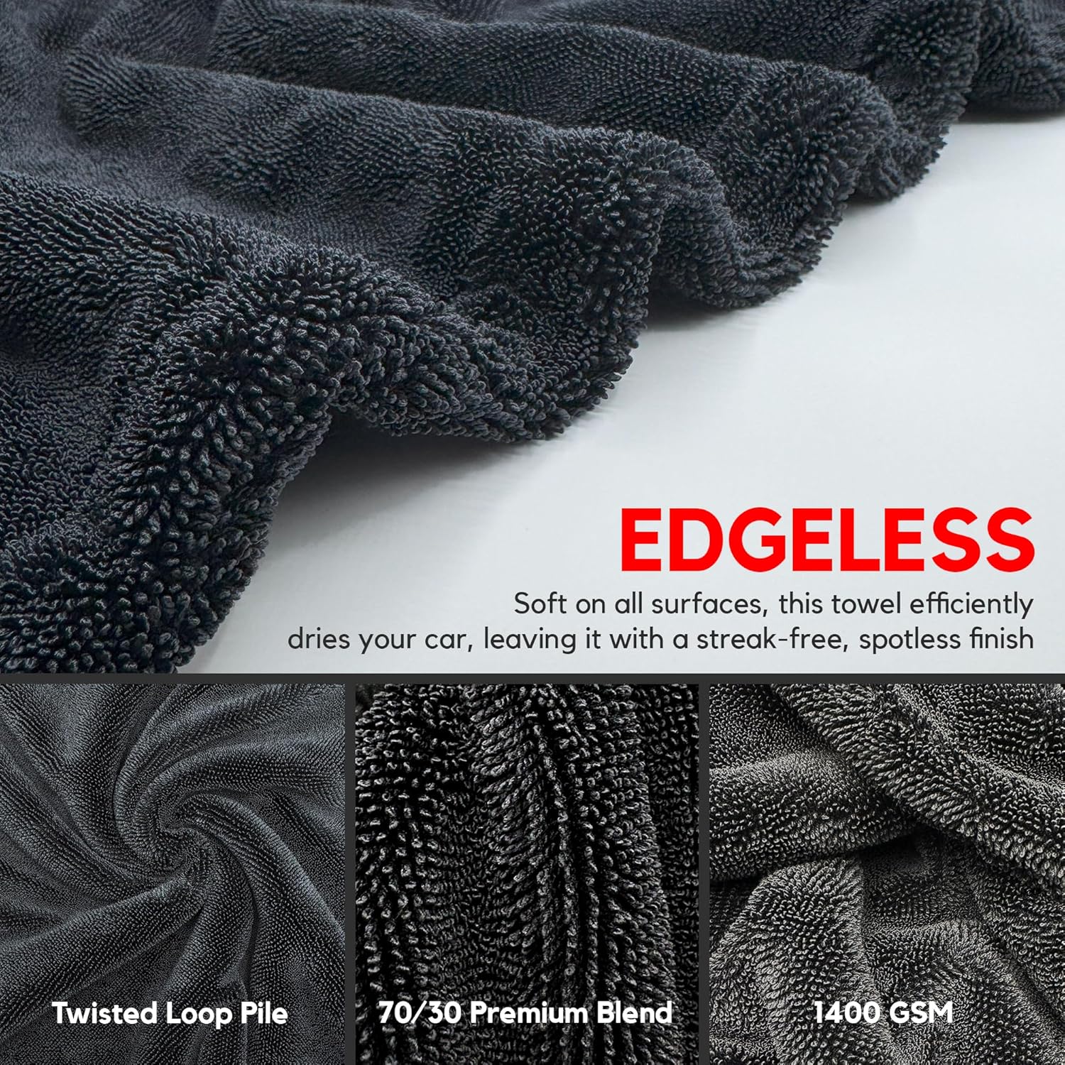 - One Towel Dries the Whole Car - Our black microfiber towel with Twisted-Loop Technology is the ultimate solution, featuring a 1400 GSM thickness that absorbs over 6 times its weight in water. This large microfiber towel ensures a quick, efficient drying experience, making it the last towel you'll ever need for car cleaning.