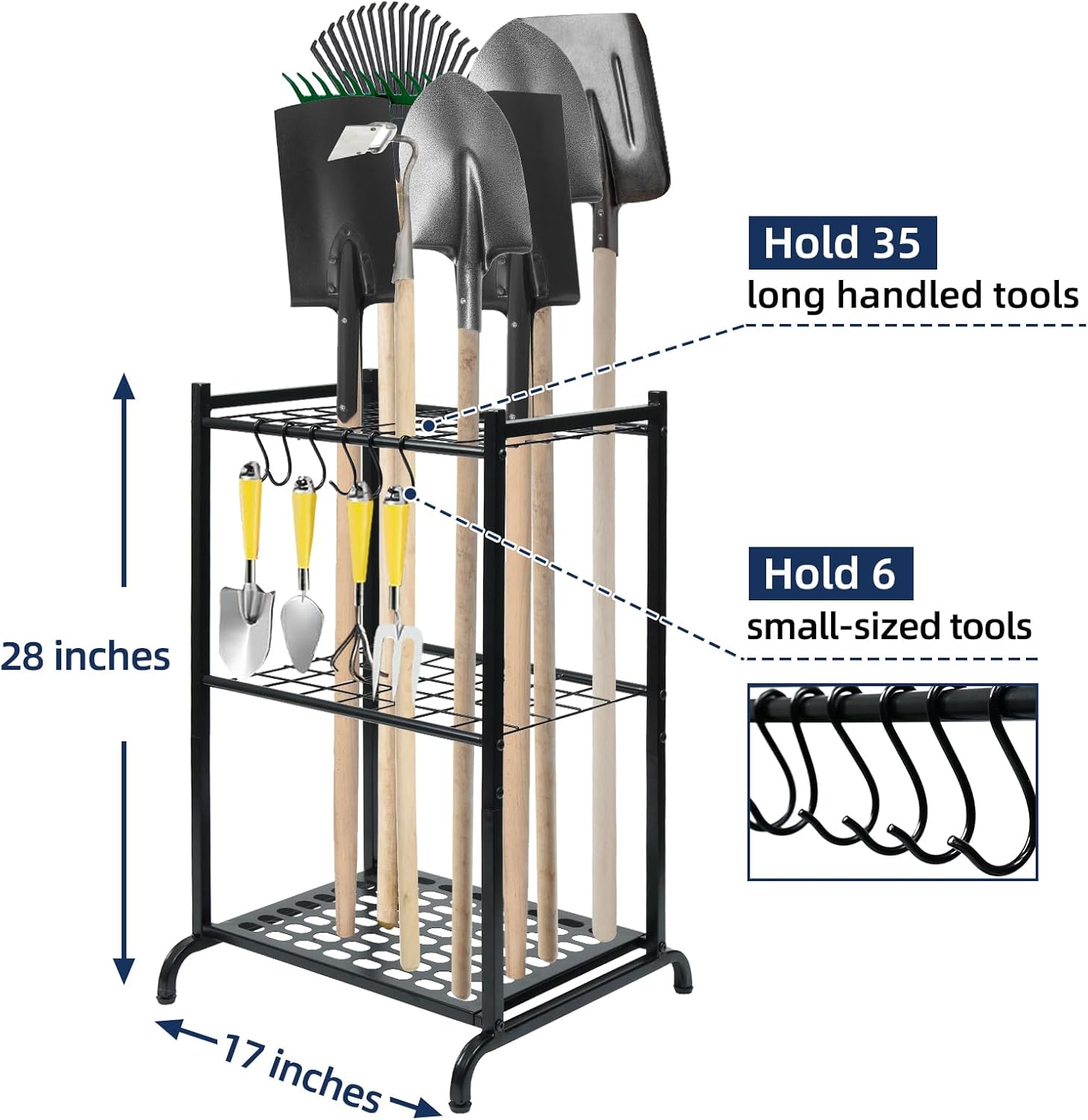 - FUNCTIONAL GARDEN TOOL ORGANIZER - In order to store more tools with different length and thickness, we design the garden tool organizer with 35 slots and 6 hooks. Each slot is 2x2 inches. The garden tool storage can hold most of your outdoor tools and keep them neat and straight to save more space.