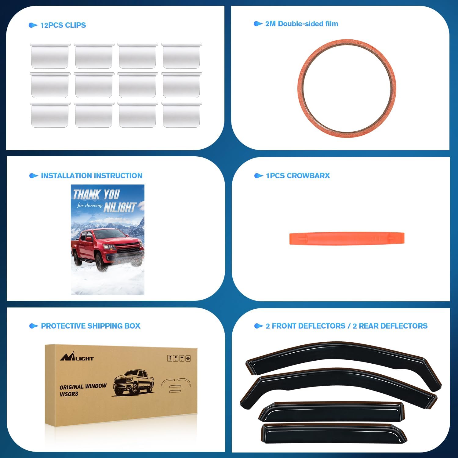 - PACKAGE INCLUDED:4 PCS Rain Guards,12pcs clips,Crowbar 1pcs,78inch double-sided tape and installation instruction