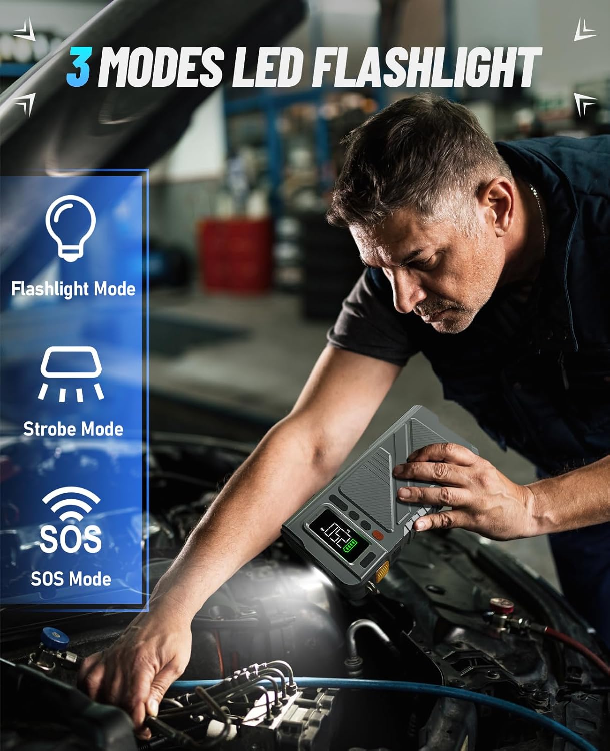 - MULTI-FUNCTIONAL USE: In addition to emergency starting and tire inflation, the portable car charger is also a power bank that supports 18W fast charging, with 3 mode LED light. This versatile car jump starter with air compressor tool adds extra functionality to the jumpstarter for all-around convenience