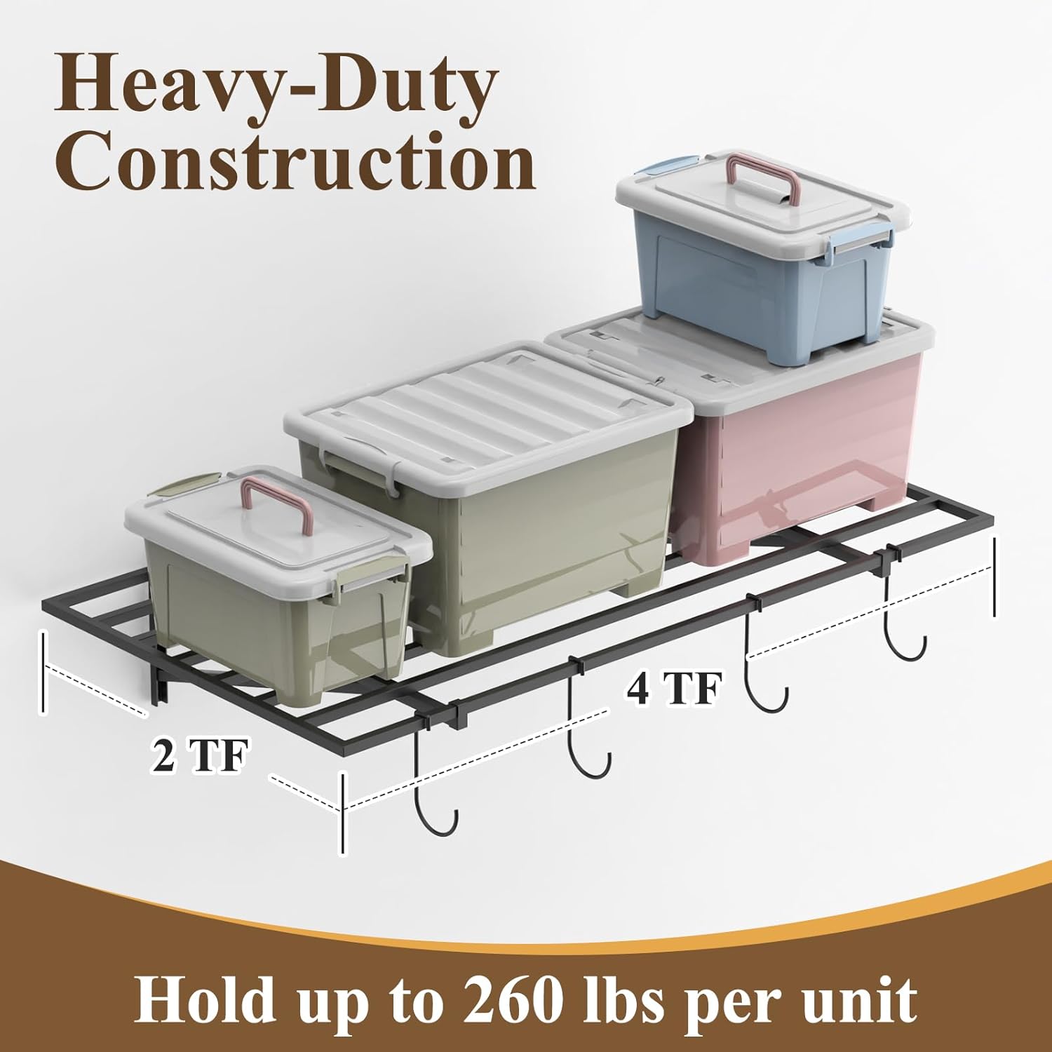 - 🔧Save Space & Superb Strength: The large wall-mounted shelves optimizes your garage space, perfect for storing various items like storage bins, boxes, tires, sporting goods, and more. Constructed from alloy steel square tubing frame, each shelf can support up to 260 lbs.