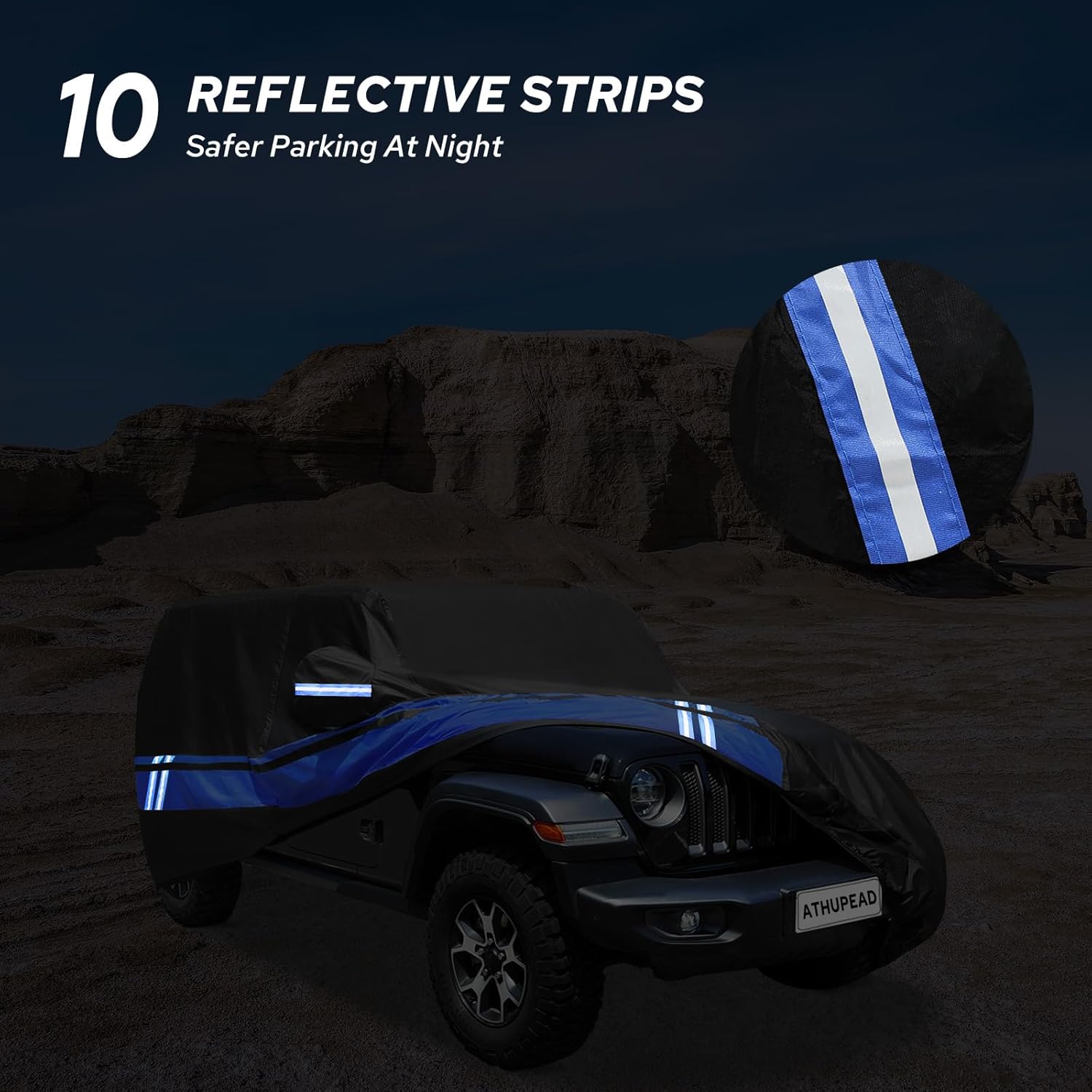 - ăMultifunctional Designă1.ATHUPEAD Jeep Waterproof 4 door has a door zipper on the driver's side. 2. Unique reflective strip design to remind others at night. 3. There are vents on the side of the car cover. 4. There is a front logo on the front of the car cover. 5. The car cover provides an antenna eyelet kit.