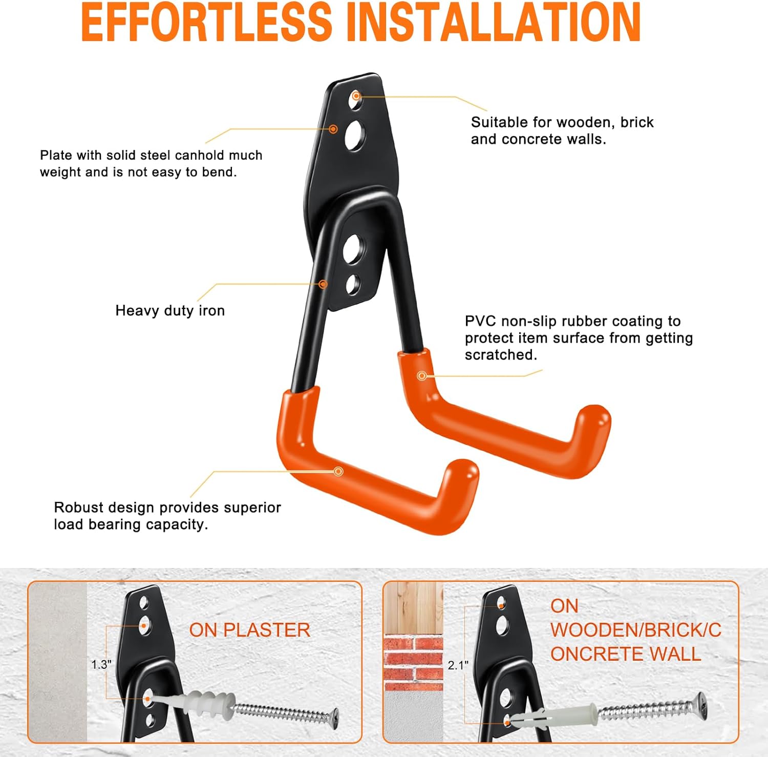 - Easy Installation: The garage hooks come with two types of screws, including 24 sets of screws and wall plugs, to accommodate different wall surfaces. Depending on your storage needs, you can install the garage wall hooks on brick/concrete/wood walls or drywall.