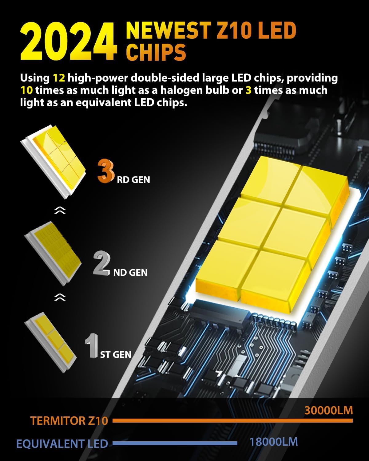 - ă800% More Brightness for Superior Night DrivingăUpgrade your night driving with our ultra-bright light bulbs, featuring 12 high-power chips per bulb, delivering a remarkable 22,000 lumens per set. With the latest Z10 technology, these lights offer unparalleled brightness and reliability, transforming your nighttime visibility.