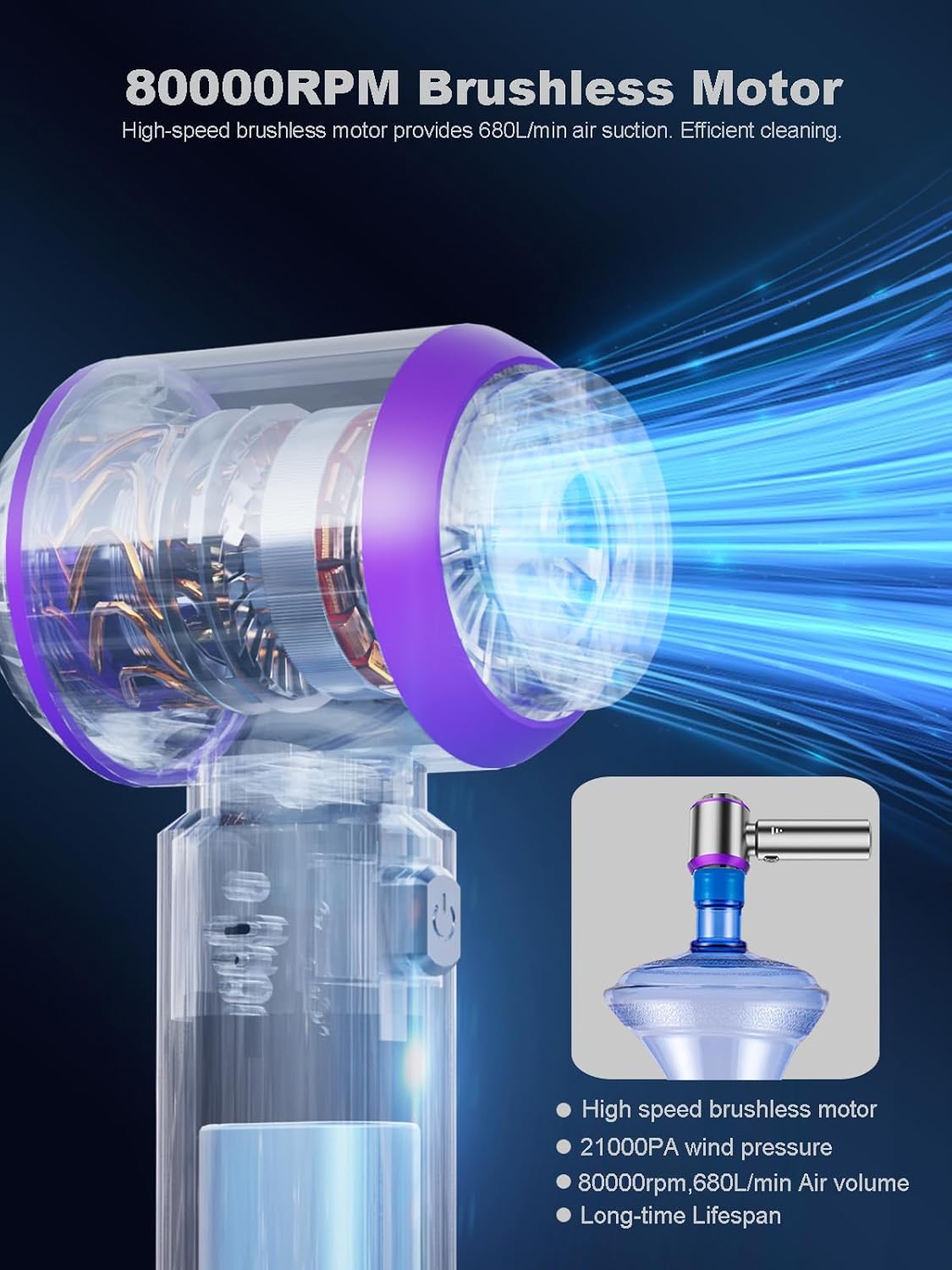 - ăBrushless Motor & 80,000RPM High PowerăVacuum/Air Duste features cutting-edge brushless motor technology, reaching up to 80,000RPM and delivering 21,000PA of suction power. Compared to traditional motors, the brushless design offers stronger suction, enhanced performance, and a longer lifespan