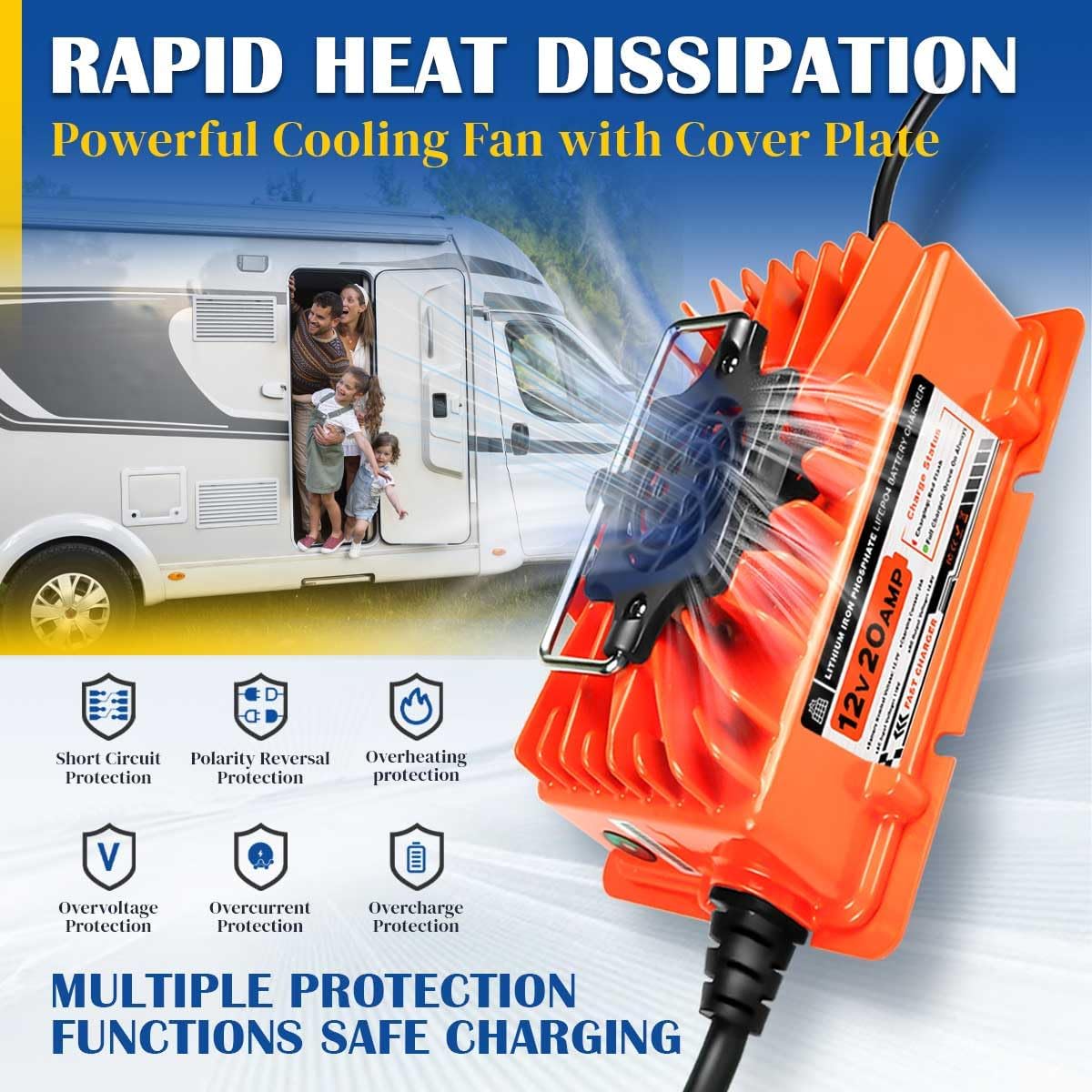 - 🚌【New 12V 20A Battery Charger】: It is 12V (14.6V) 20A LiFePO4 lithium battery charger, charging voltage: 14.6V, charging current: 20A, rated input voltage: 100V-240V AC; 50Hz to 60Hz. Meanwhile,newly designed aluminum body and large cooling fan with cover plate make the heat dissipation more efficient, reducing power waste and improving charging efficiency.