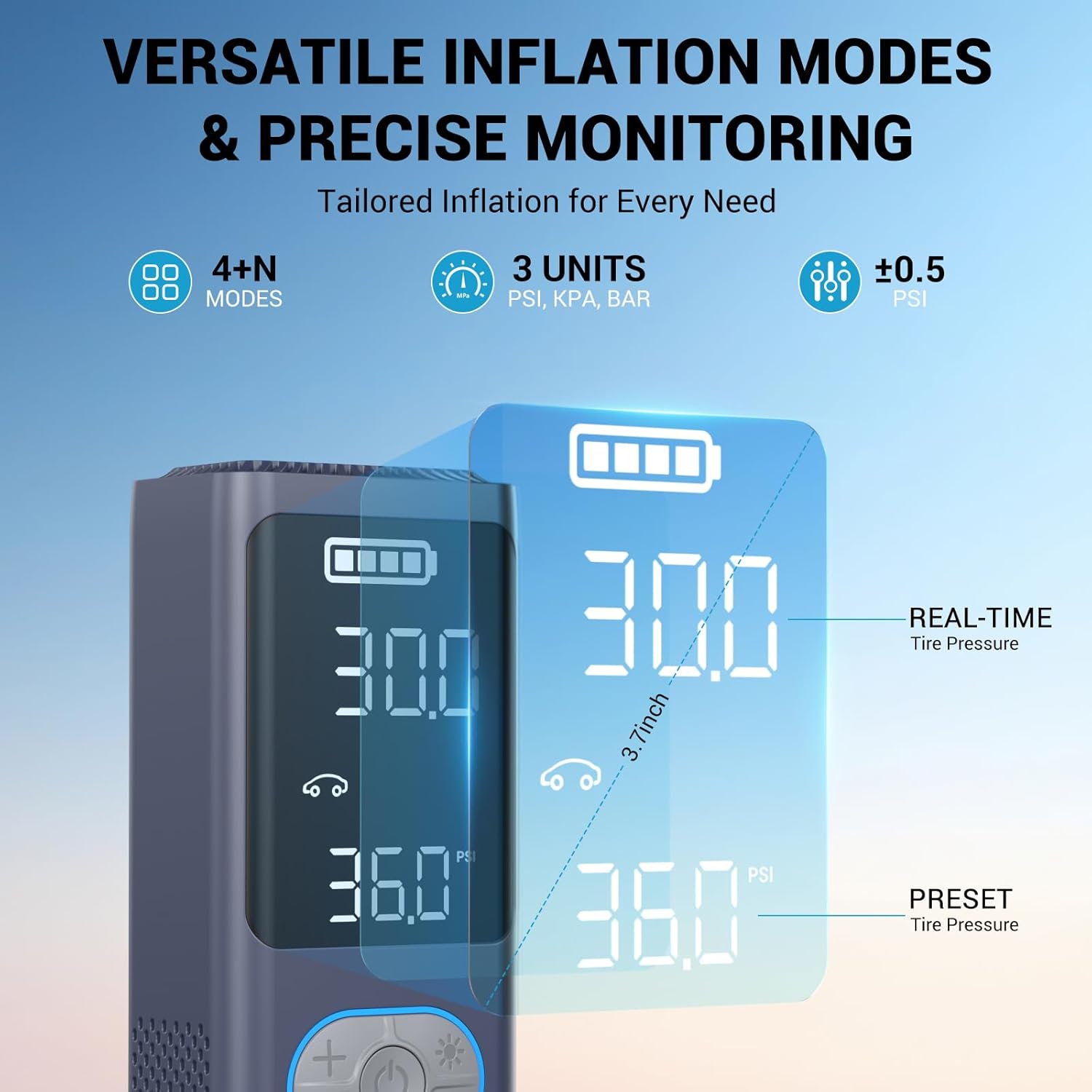 - Modos de inflado versátiles y monitoreo preciso: Con más de 4 modos para inflar autos como Tesla o Ford 150, bicicletas, balones y más, este compresor portátil te permite cambiar fácilmente entre PSI, BAR y KPA. Su pantalla LCD doble de 3.7 pulgadas ofrece lecturas precisas con un margen de error de solo ±0.5 PSI, para que siempre tengas el control de la presión de tus neumáticos.