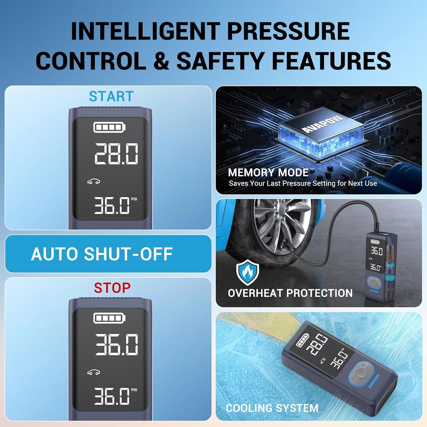 - Inflador de neumáticos portátil: Equipado con un modo de memoria de presión, el inflador digital AVAPOW recuerda tus configuraciones preferidas y se apaga automáticamente al alcanzar la presión deseada, evitando el sobreinflado. Además, cuenta con protección contra sobrecalentamiento y un sistema de enfriamiento de múltiples puertos, garantizando un funcionamiento seguro y confiable.
