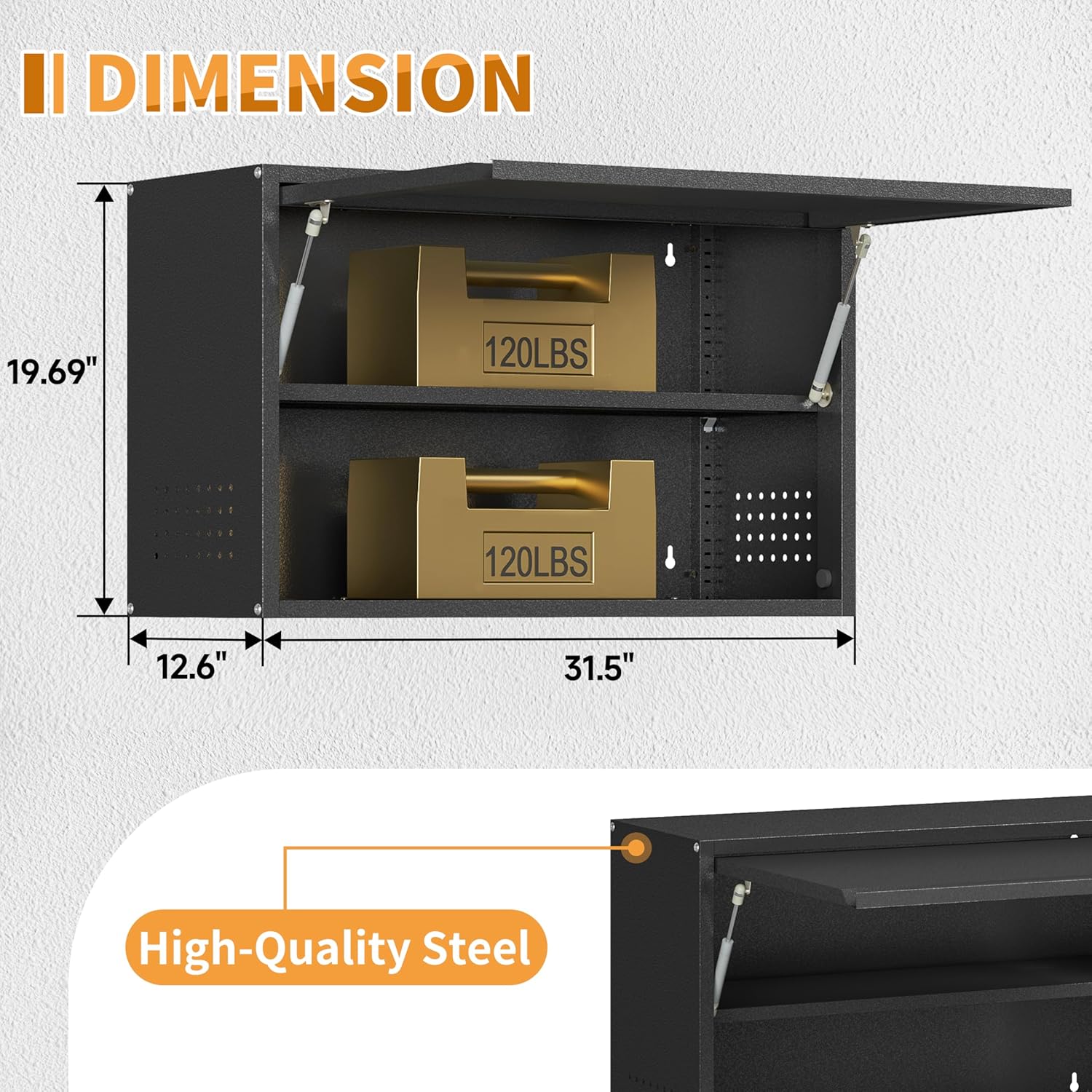 Metal Garage Wall Cabinet with Up-Flip Door, Black Float Tool Cabenit with Adjustable Shelf,Upper Storage Cabinets with Pegboard for Kitchen,Garage,Workshop,Warehouse (19.7" H,Black)