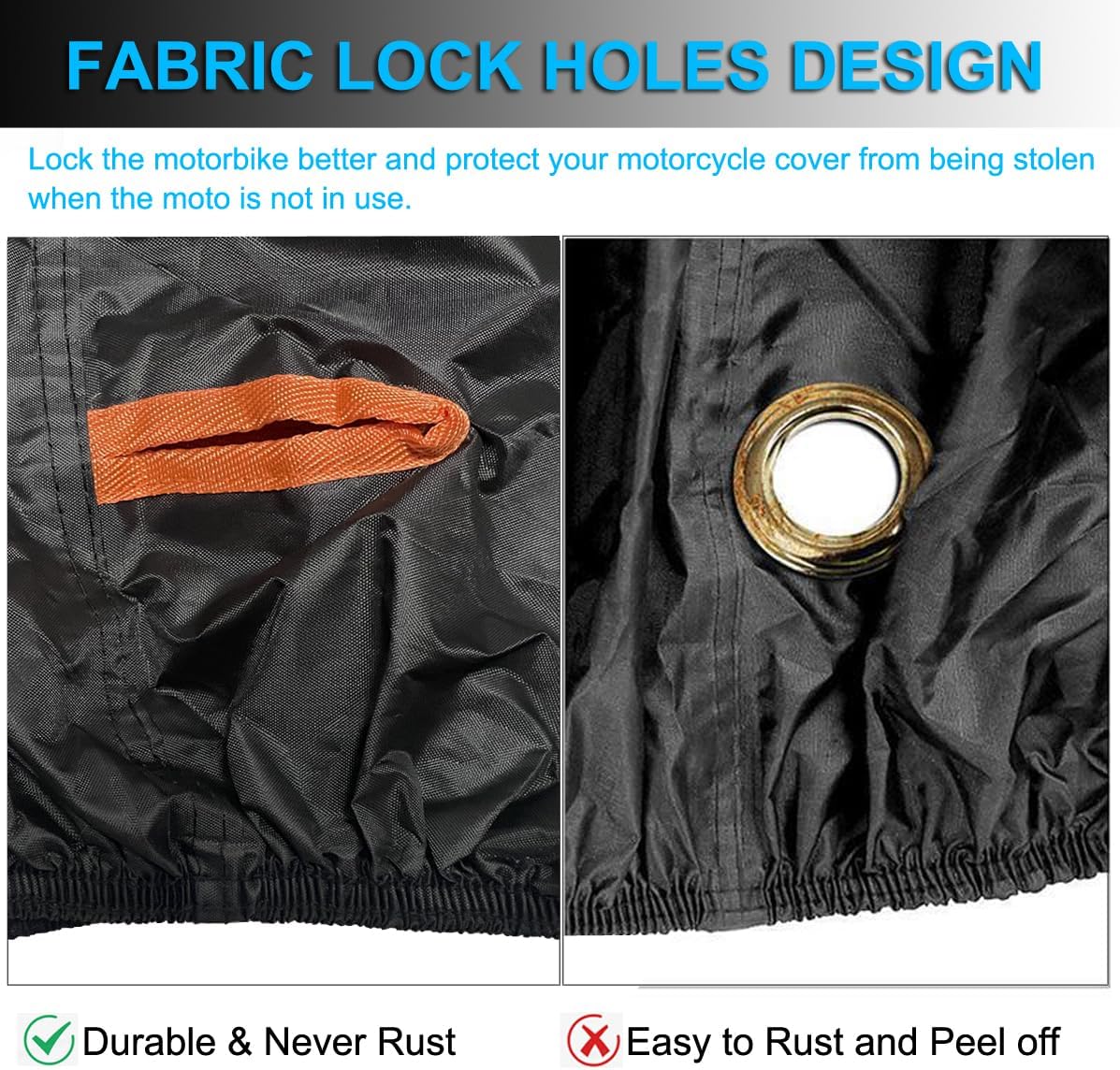 - 【Anti-theft Lock Holes】 Designed with 2 lock holes (front and rear)is helpful to lock the motorbike better and protect your motorcycle cover from being stolen. Compared with the metal lock hole, ours is never rust and peeling, perfect for motorcycle outdoor storage.