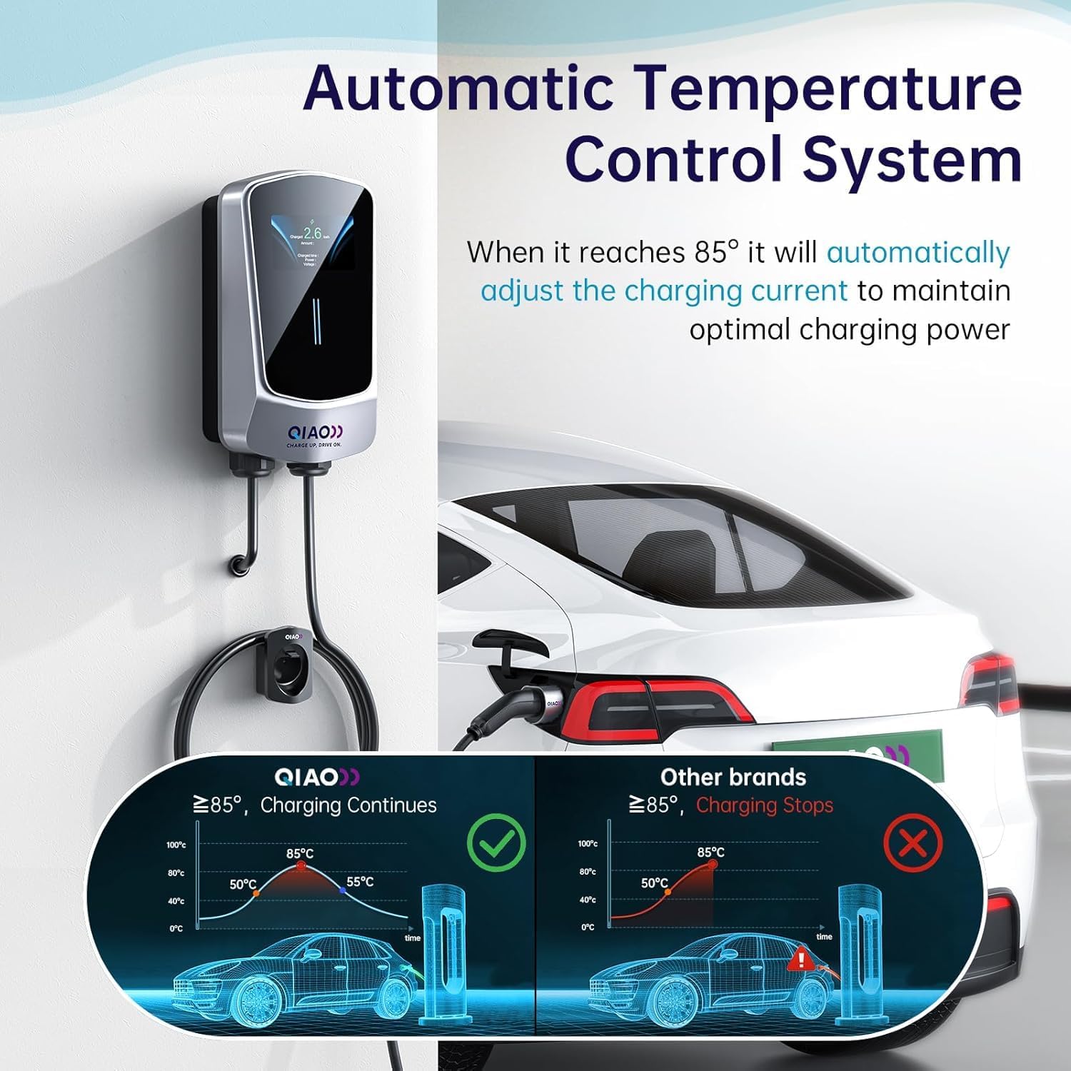 - 【Automatically Adjusts Current at 85°C 】To ensure safety and continue charging, when the internal temperature of the charging station reaches 85 degrees, QIAO)) EV charging station will automatically adjust the charging current to maintain the optimal charging power for your electric vehicle. (Note: Most electric vehicle chargers on the market will stop charging when the internal temperature exceeds 85°.) While effectively ensuring charging safety, it also takes into account charging speed.
