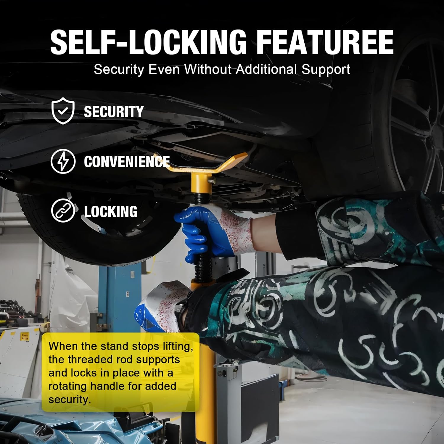 - FOOT PEDAL DESIGN - Adjustable threaded bar that adjusts the 52.8-76.5 "position to suit your needs. Threaded levers also provide automatic locking to prevent unsupported stands from harming users and vehicles.