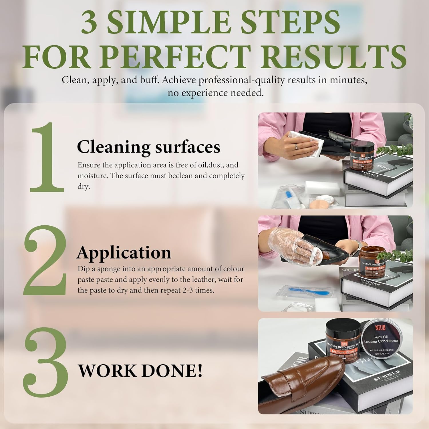 - Suitable for Most Leather Surfaces: Our Leather Recoloring Balm is ideal for sofas, couches, car interiors, and leather clothing. It works effectively on a variety of leather surfaces, including real and synthetic leather, enhancing the color and appearance of your cherished items. Not recommended for suede.