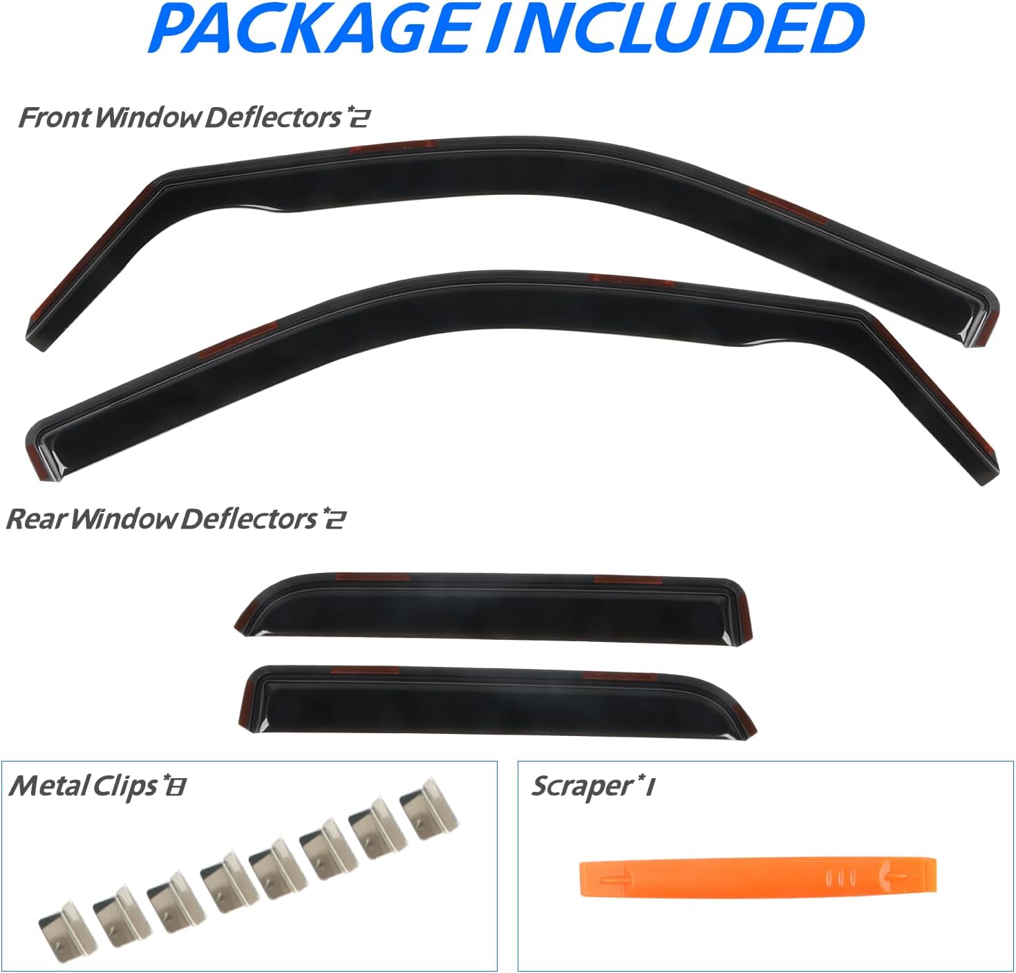 - Easy Installation: Come with 4 pcs side window deflectors, 8 pcs clips, 1 pcs plastic Crowbar for a durable and secure installation. No complicated instructions are needed. Attention: Please apply the clip to fix the rain guards