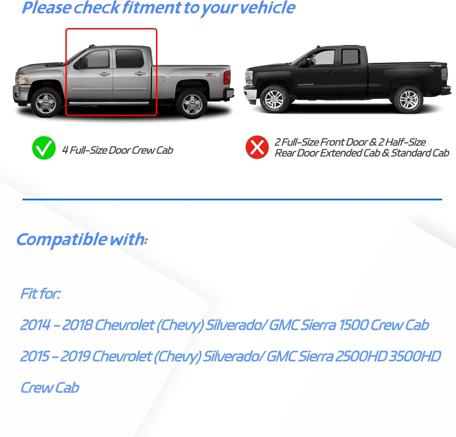 - : Vehicle Service Type Fit for 2014-2018 Chevrolet Silverado 1500 Crew Cab; 2015-2019 Chevrolet Silverado 2500 HD Crew Cab; 2015-2019 Chevrolet Silverado 3500 HD Crew Cab; 2014-2018 GMC Sierra 1500 Crew Cab; 2015-2019 GMC Sierra 2500 HD Crew Cab; 2015-2019 GMC Sierra 3500 HD Crew Cab (ONLY for 4 FULL-SIZE Doors) Fit for 2014-2018 Chevrolet Silverado 1500 Crew Cab; 2015-2019 Chevrolet Silverado 2500⌠See more