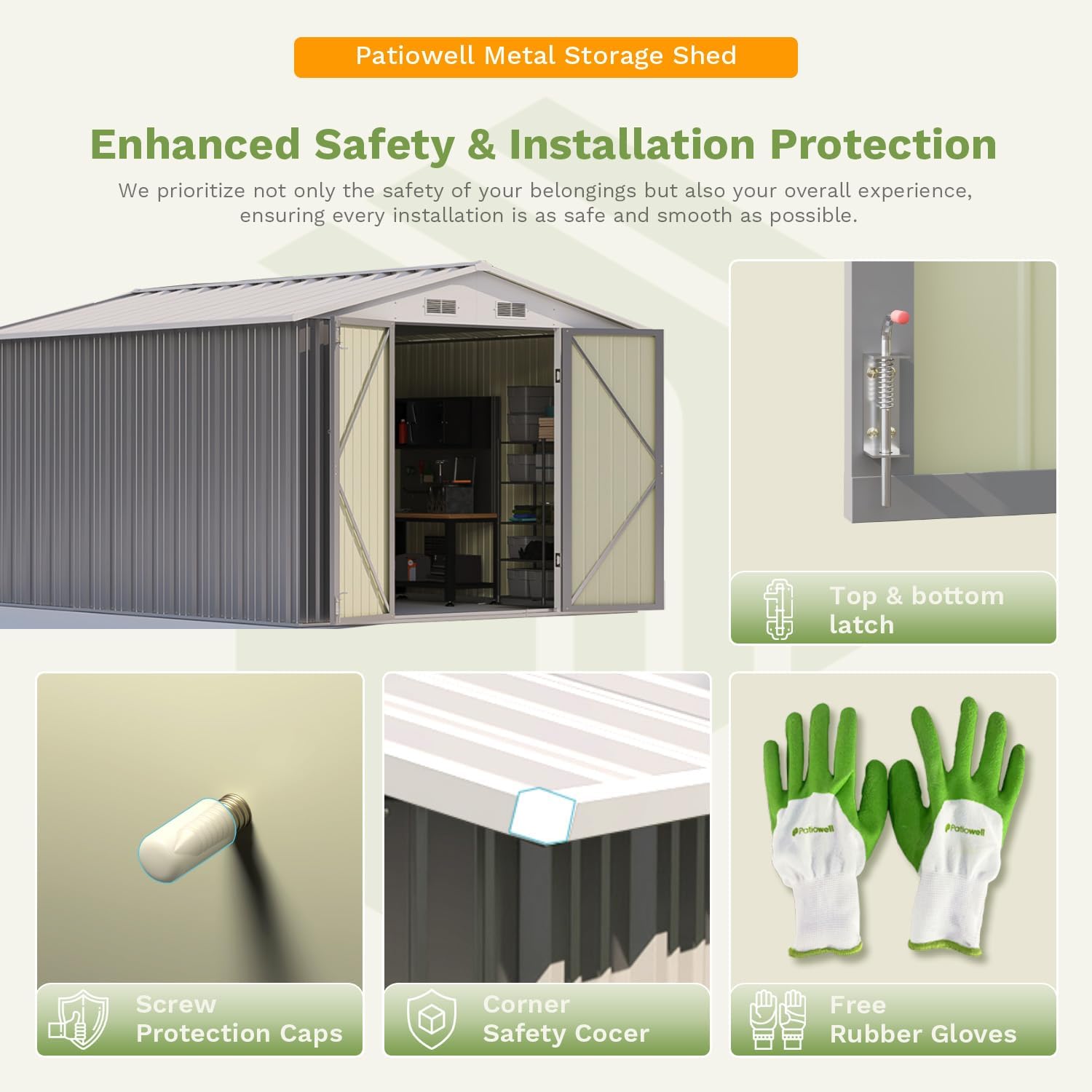 Patiowell 10 x 12 FT Metal Storage Shed for Outdoor with Floor Frame, Steel Yard Shed with Design of Lockable Doors, Utility and Tool Storage for Garden, Backyard, Patio, Outside use, Grey