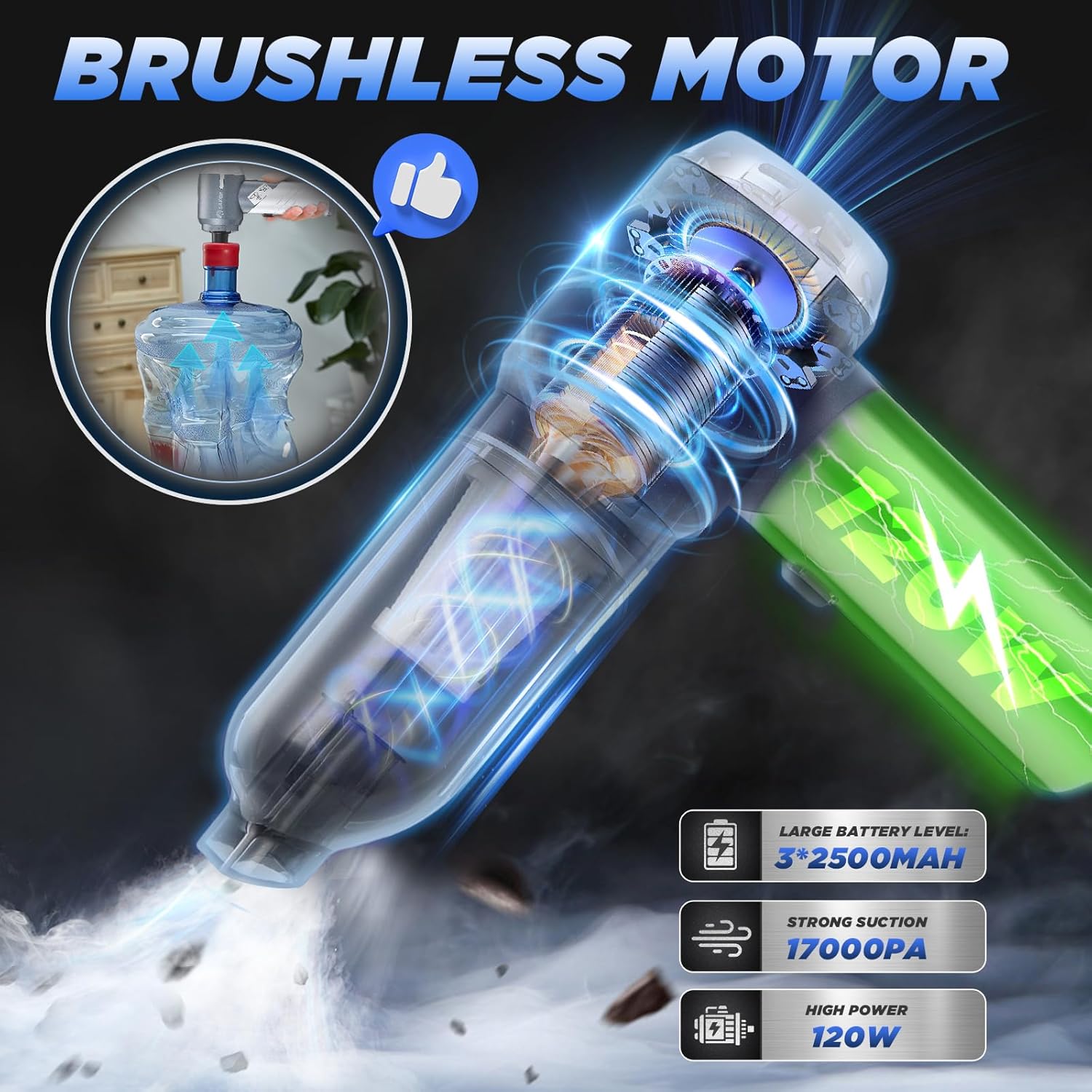 - ăPowerful Suction ForceăThe motor of this car vacuum cleaner has been upgraded to have a super strong suction of 17000PA, which can achieve three levels of suction adjustment, making it very easy to clean large and small areas of stains, including sand, dust, pet hair.