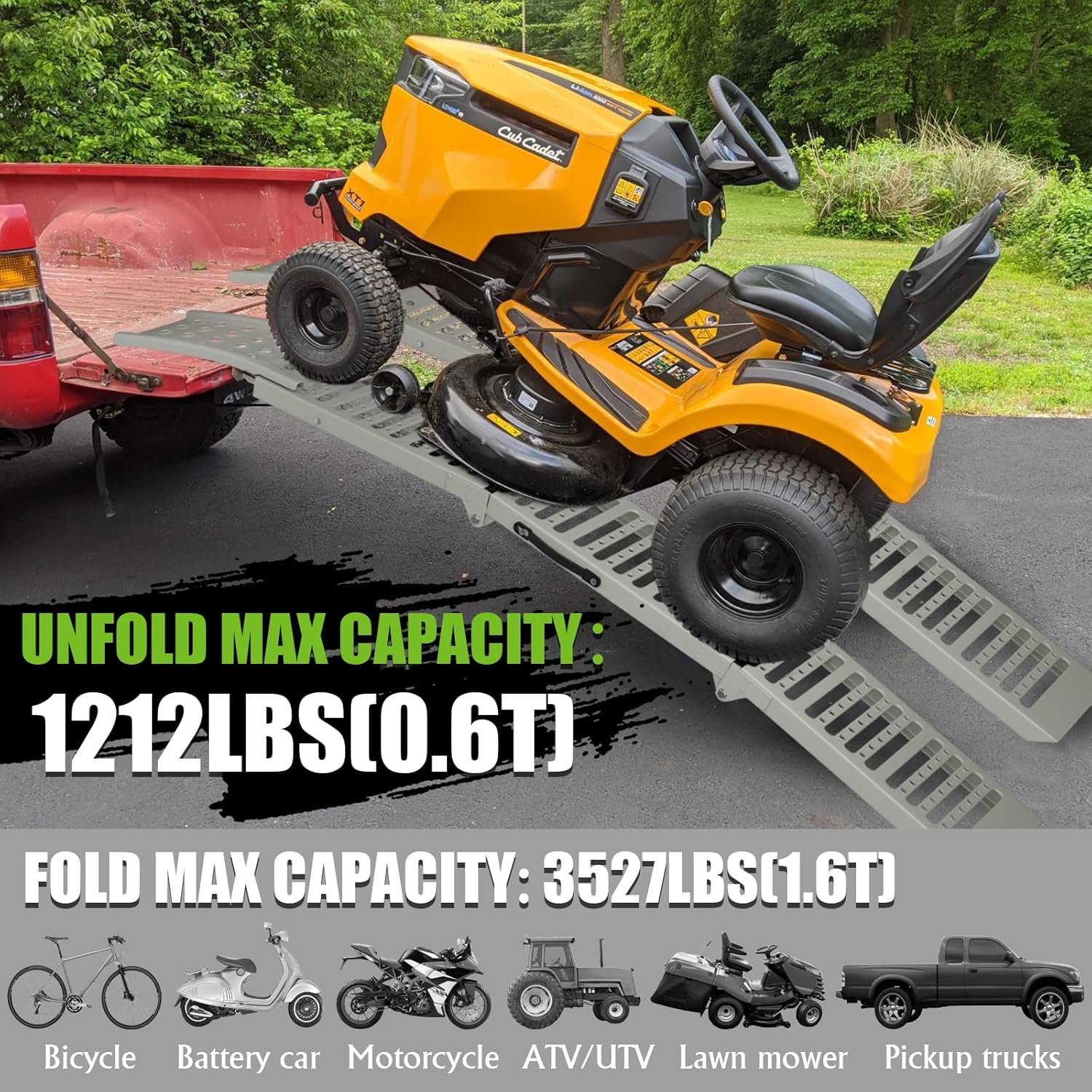 - 【Dual-Purpose Ramps】:Our atv ramps is not just versatile,it's a two-in-one solution. It serves as a standard loading ramps for pickup trucks, capable of supporting up to 2,424 lbs (2.4 tons) when using 2 ramps for lawn mower. But that's not all; This motorcycle ramp can also be used as an oil change ramps. When utilized for this purpose, the combined weight capacity of all 4 truck ramps reaches an impressive 14,108 lbs (6.4 tons), equivalent to the weight of a typical pickup truck