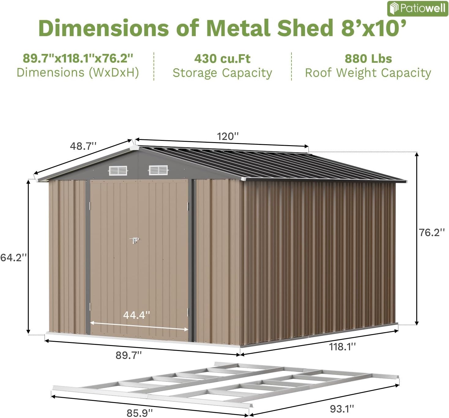 Patiowell 8x10 FT Outdoor Storage Shed with Floor Frame, Large Garden Tool Metal Shed with Sloping Roof and Double Lockable Door, Outdoor Shed for Backyard Garden Patio Lawn,Brown