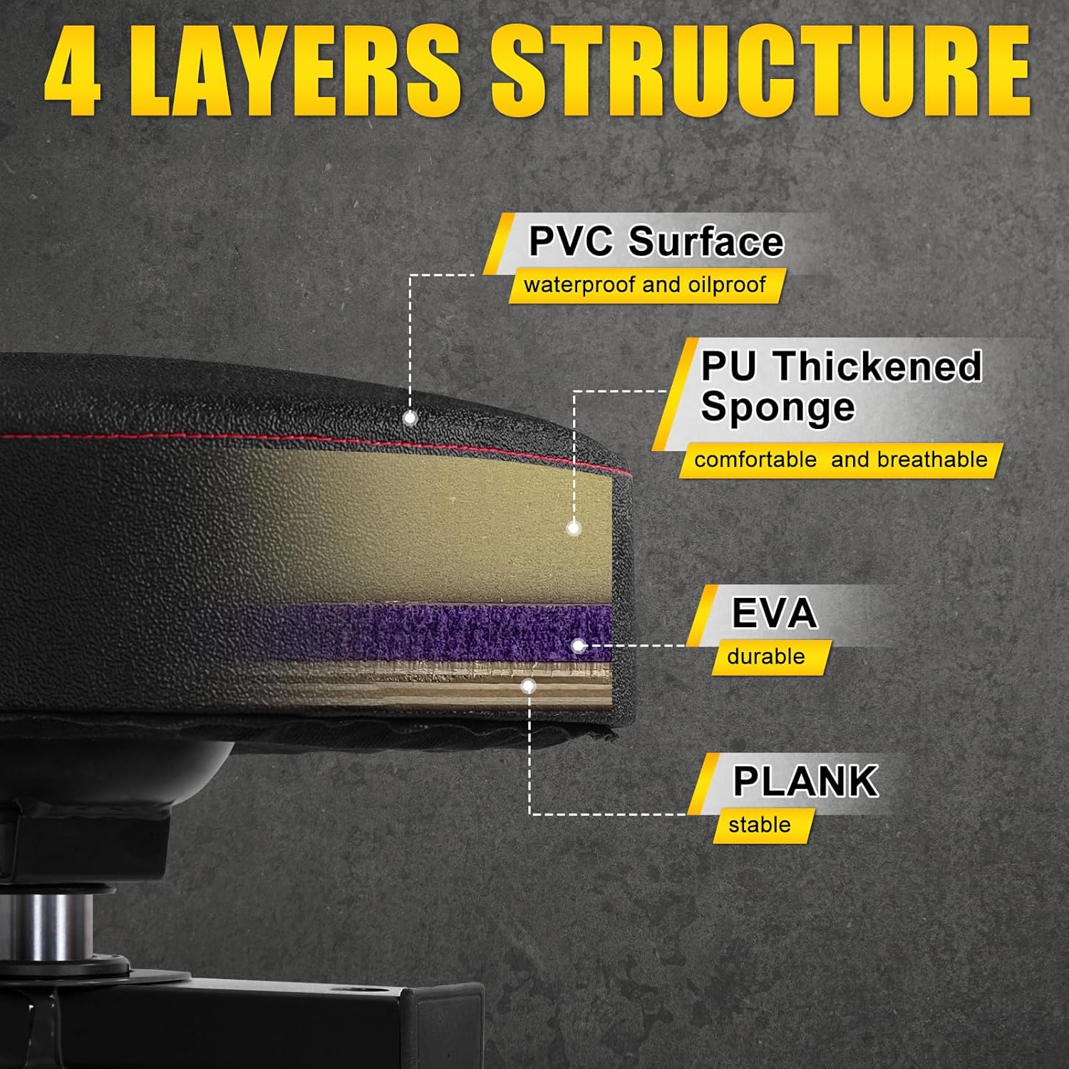 - 【4 layers Structure】The mechanic chair's thick cushion is 3.74"/9.5cm height and consists of FOUR layers structure. The first layer is a solid wooden plank, the second layer is a durable EVA, the third layer is a comfortable and breathable PU thickened sponge, and the fourth layer is a waterproof and oilproof PVC surface. Soft, Firm, and Comfortable. Make it easy to be cleaned