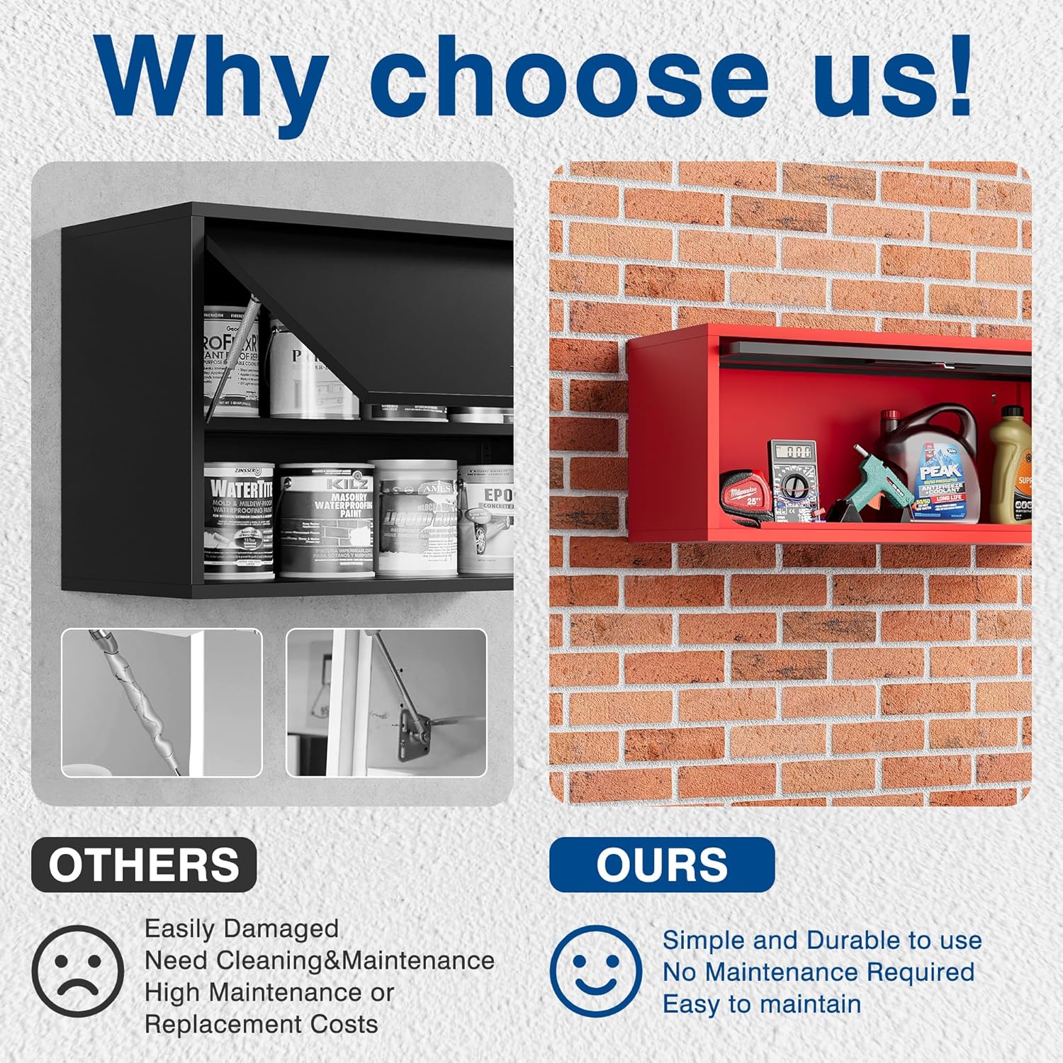 - Revolutionary Upgraded Opening and Closing System: Traditional left-right opening methods carry a risk of bumping heads. Our storage cabinets feature a unique top-bottom opening mechanism, where the entire door can be recessed into the cabinet itself, making full use of upper space and facilitating easy access to items stored inside.