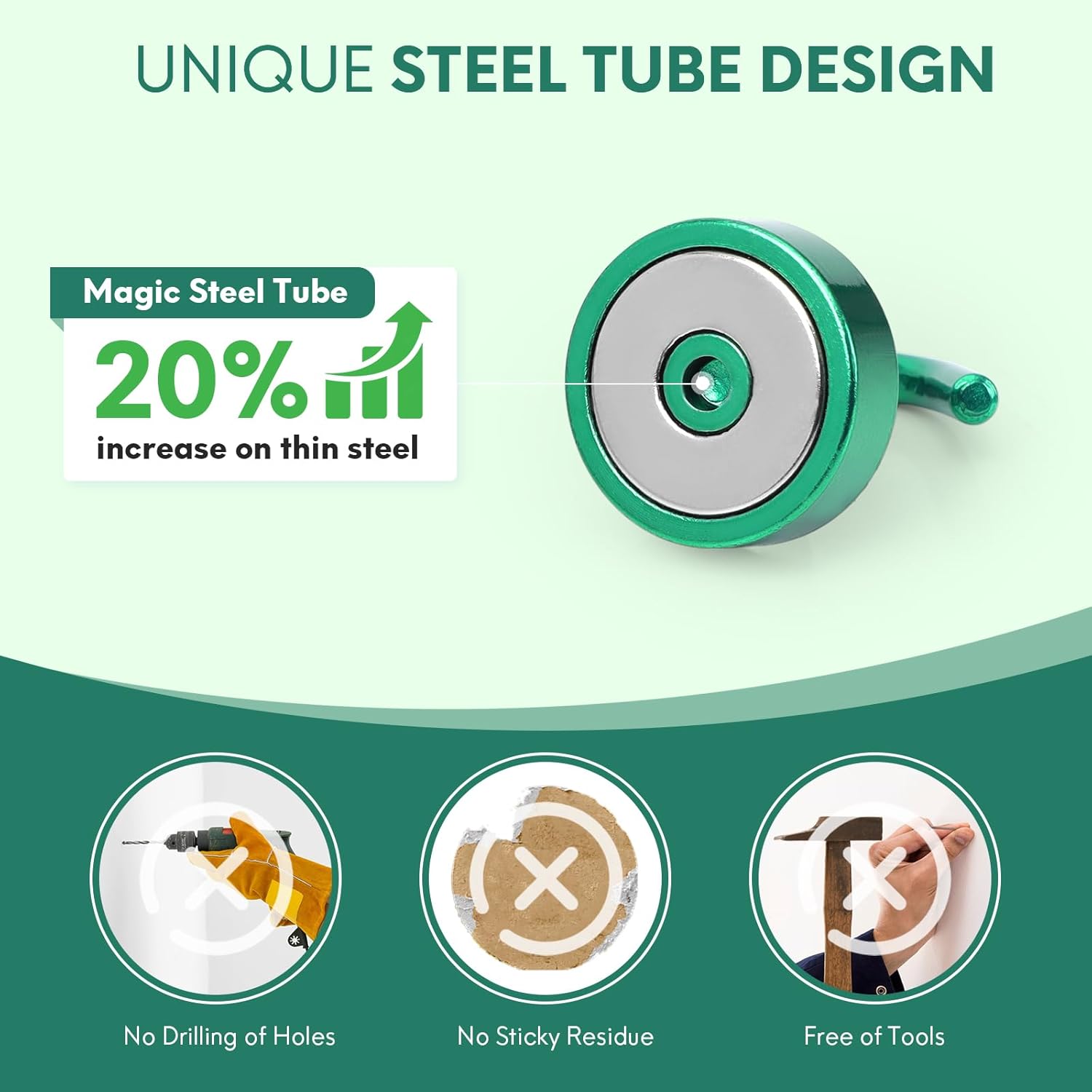 - ✔MAGIC STEEL TUBE DESIGN - Unique design of steel tube inside the base of magnetic hooks greatly increases the attractive force , especially on thin steel! It increase approximately 20% force comparing those none-tube magnets. it solves the problem of weak force on thin steel. Permanent magnetic hook with magic steel tube, strong magnetism lasts forever!