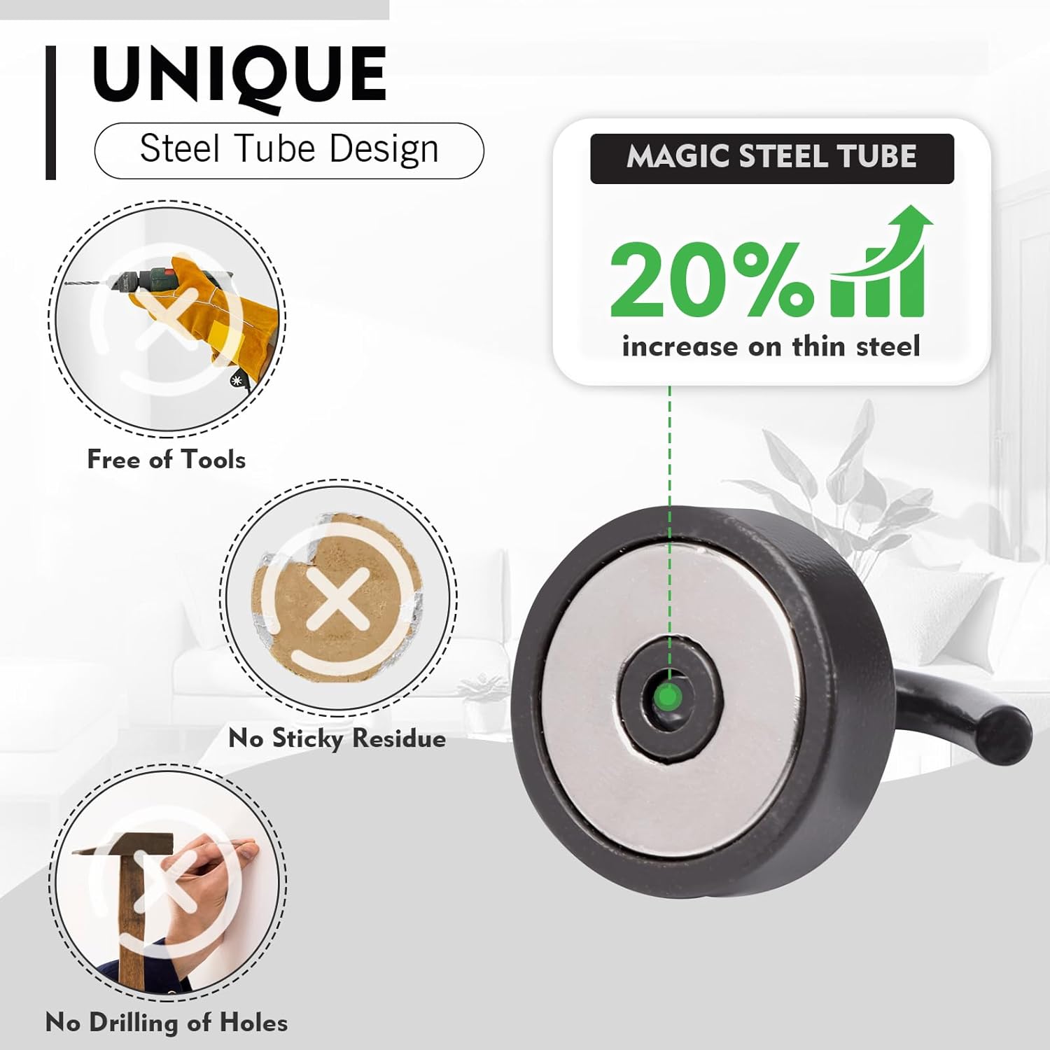- ✔MAGIC STEEL TUBE DESIGN - Unique design of steel tube inside the base of magnetic hooks greatly increases the attractive force , especially on thin steel! It increase approximately 20% force comparing those none-tube magnets. it solves the problem of weak force on thin steel. Permanent magnetic hook with magic steel tube, strong magnetism lasts forever!