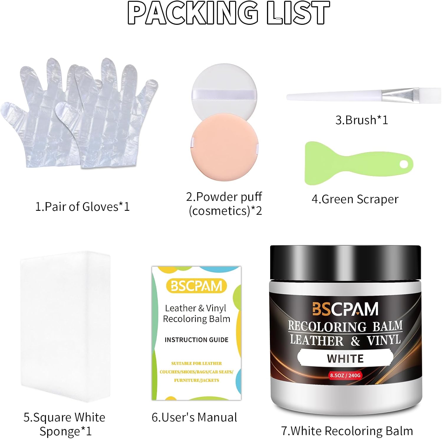 - Easy DIY Repairs: Leather repair kit includes, 1 Recoloring Balm + 1 Sponges + 2 Gloves + 2 Powder Puff + 1 Brush + 1 Putty Knife + User's Manual,meet any leather repair project