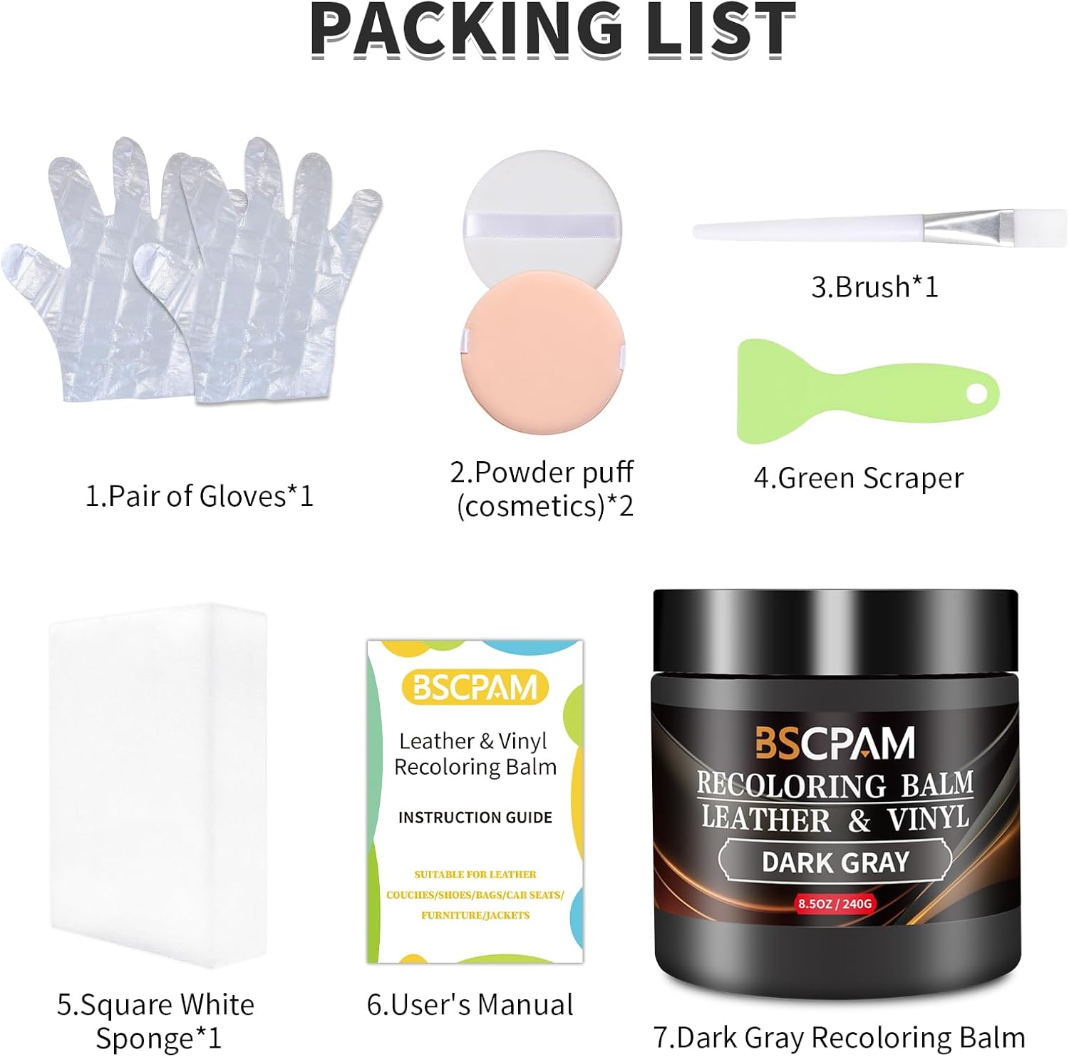 - Easy DIY Repairs: Leather repair kit includes, 1 Recoloring Balm + 1 Sponges + 2 Gloves + 2 Powder Puff + 1 Brush + 1 Putty Knife + User's Manual,meet any leather repair project