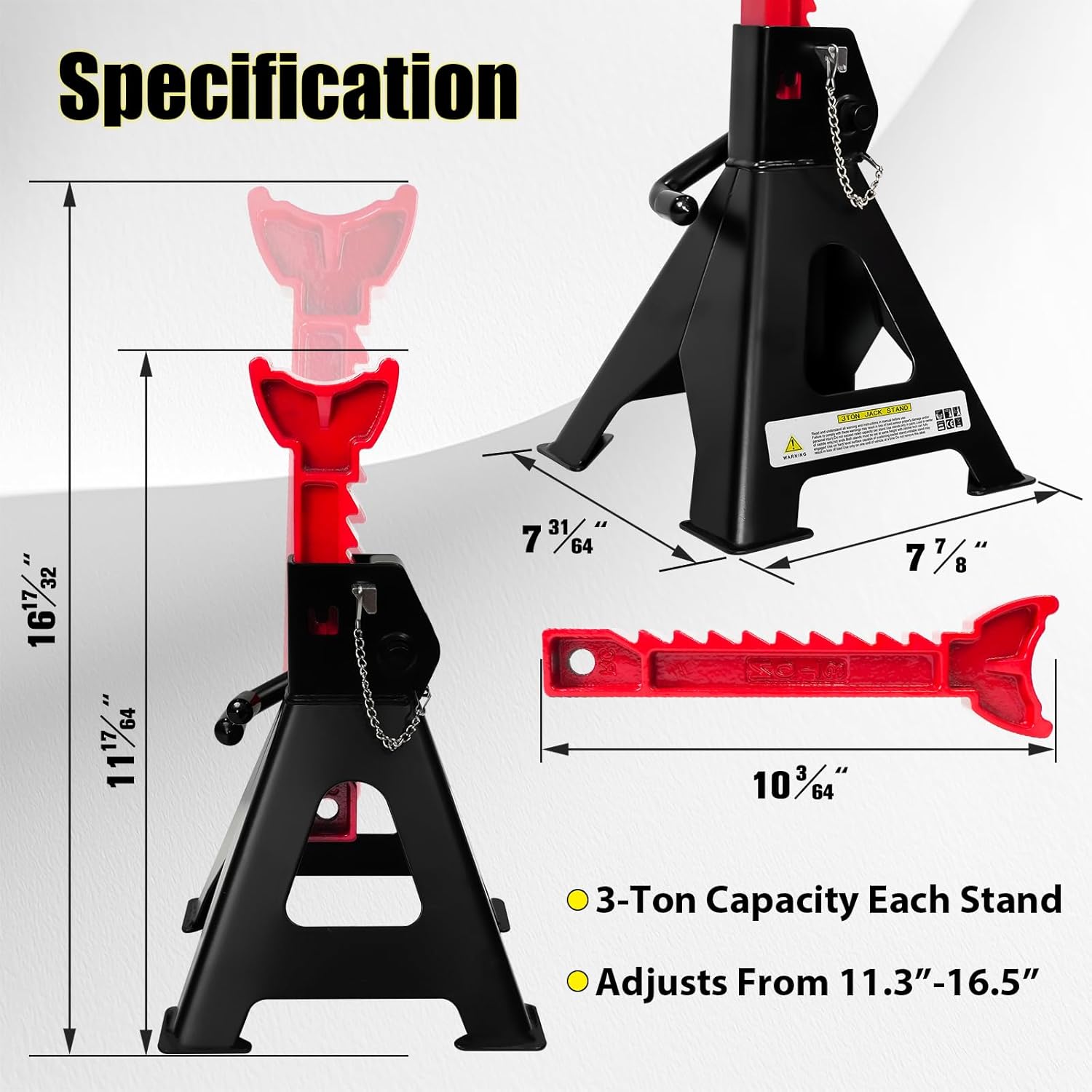 - 【Excellent Performance】:Our jack stands 3 Ton has a flexible range of 9-levels of adjustable height, a lifting range of 11.22" to 16.54" (285-420mm), and a load capacity of 3 tons (6,600 lbs). The rigid steel construction ensures the jack stand is strong and corrosion-resistant. The jack stand features a wide pyramid base, providing extra strength and stable support. And the saddle has a large surface area for better contact with the load being supported