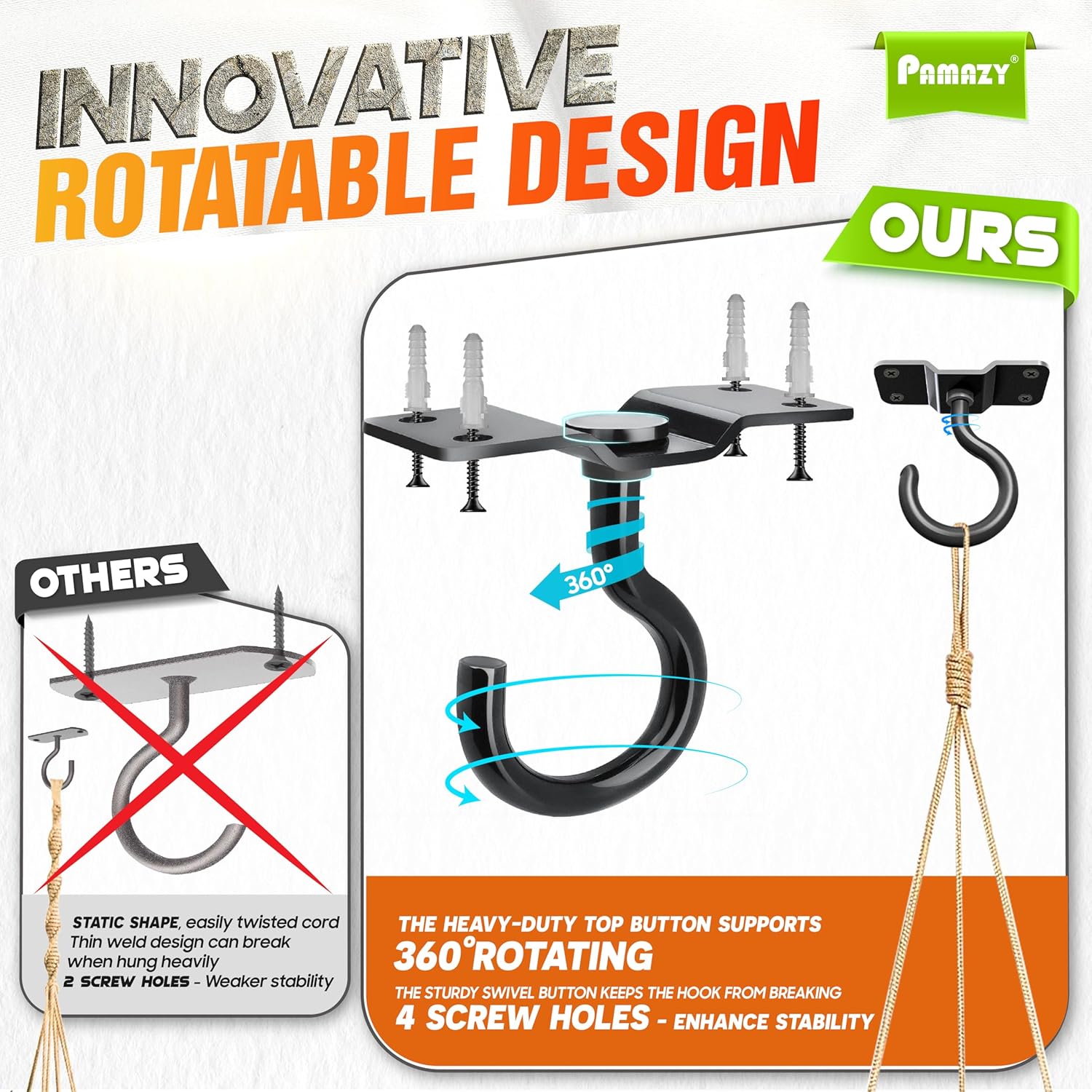 - [360-degree Horizontal Rotation Capability] Upgrade to a special version with the hook's free rotation function, making installation and use extremely easy. You can hang objects at any angle or direction. Additionally, the hanging cords will not get twisted due to surrounding influences, unlike other products with a static design.