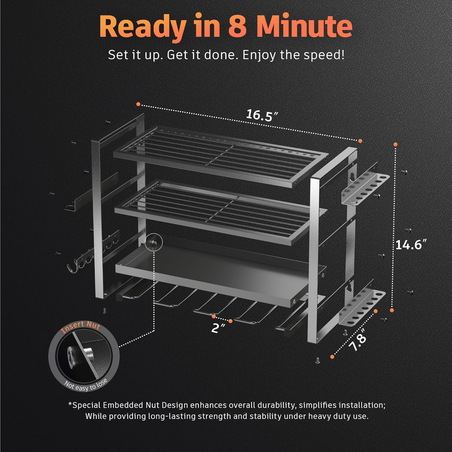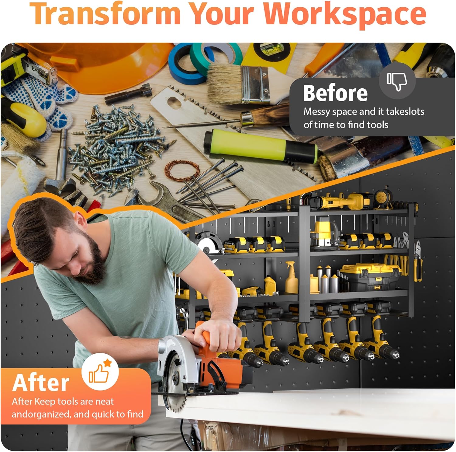 - A Monster Win for Storage: Nacial power tool organizer wall mount offers a larger, more optimized heavy-duty metal storage shelf for all your power tools and their compatible accessories. Crafted from premium cold-rolled steel (SPCC) and coated with carbon powder, it ensures unmatched stability and strength. Designed to hold up to 4 cordless drill, it features a versatile 4-layer storage rack. Say goodbye to endless searching and keep tools organized with our next-level storage solution