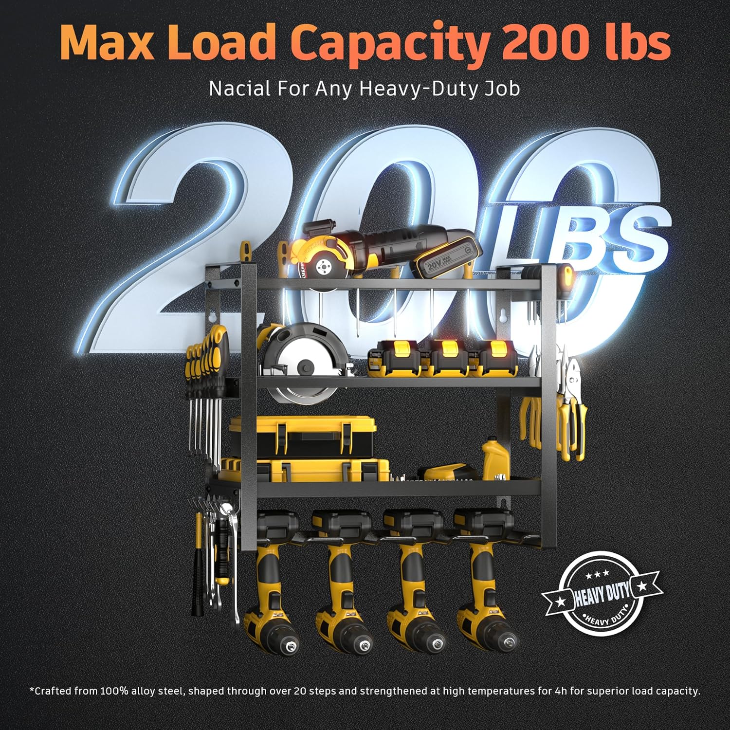 - Max Load Capacity 200 Lbs: Nacial power tool organizer wall mount crafted from 100% premium heavy-duty solid steel, shaped through over 20 precision steps and strengthened at high temperatures for 4 hours for 200 lbs superior load capacity. Can secure mounting on concrete, drywall, or pegboard, ensuring exceptional stability. With our tools organizer wall mount, your tools will always stay securely in place, ready for any task