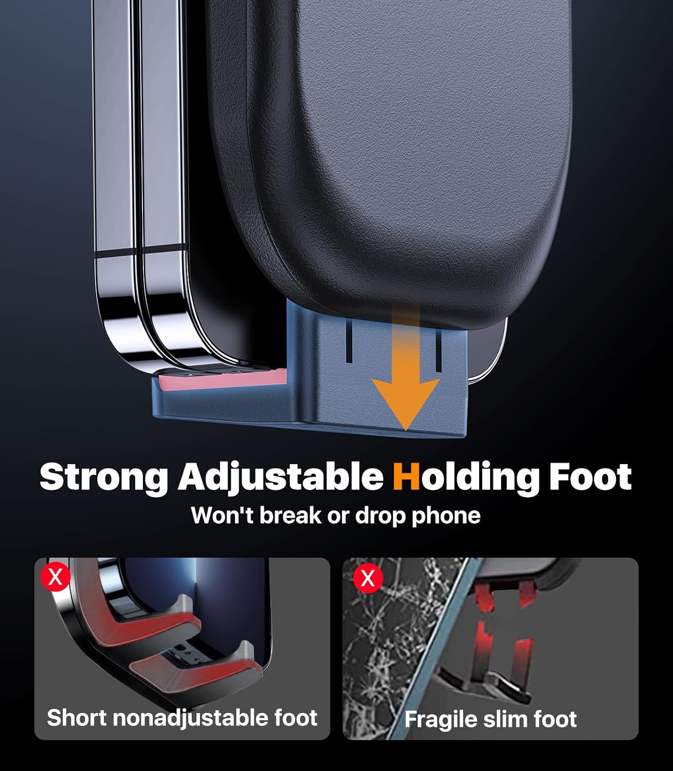 - Big Phones & Heavy Cases Friendly: The extended clamp arm and the adjustable strong holding foot design, making this car mount for iPhone fits small phone as well big phones, easy to hold phones wearing heavy cases, even wallet or ring. The phone clamp won't touch falsely your volume buttton or block camerain like other nonadjustable holders. This just right design let you record great moment on the road at any time. The qucik release button on the back of phone clamp let you get phone easily.