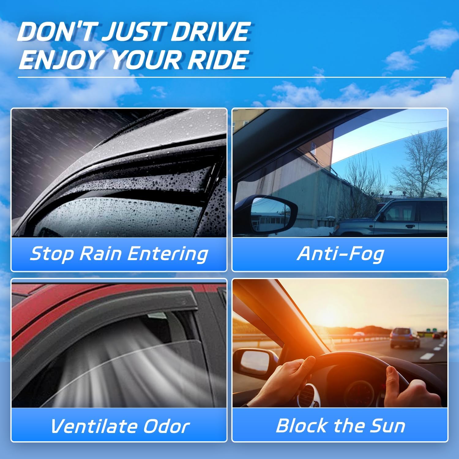 - Improved Ventilation and Air Flow: Allows fresh air to circulate through open windows while keeping the rain out or reduces heat. Reduce mirror and window fogging; reduce sun glare through side window