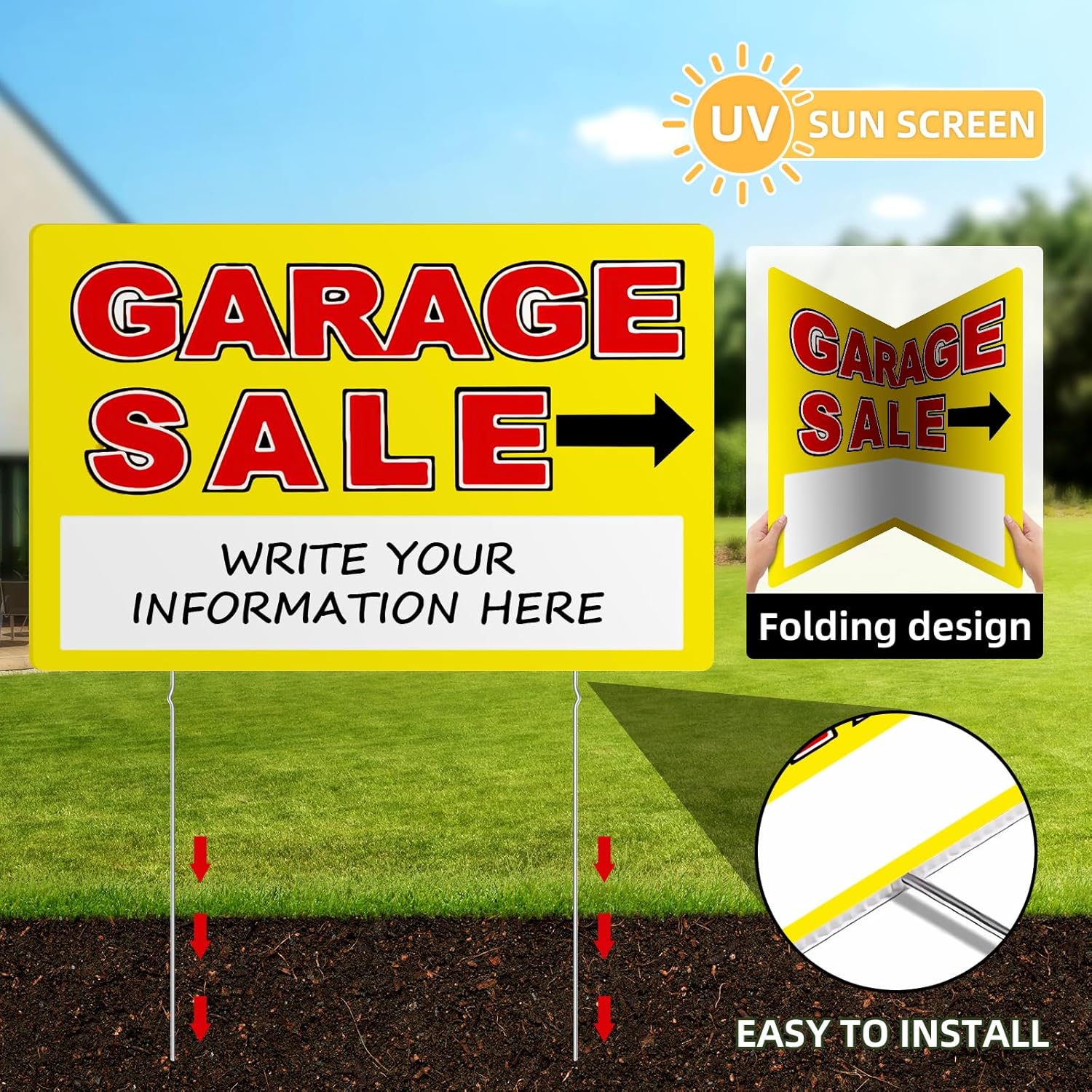 - Excellent Design: The garage sale sign features a double sided sign that uses large, eye-catching colours to draw attention to the sign, includes a left arrow sign and a right arrow sign, with a blank area for writing your phone number, address and other custom information.