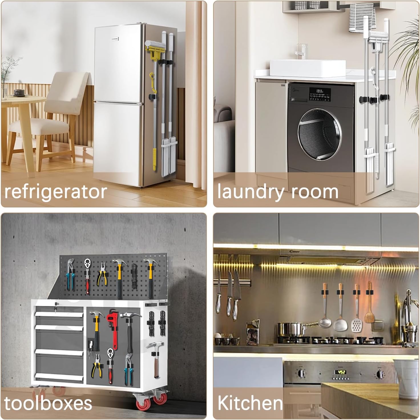 - [EASY TO INSTALL] Without drilling holes, the magnetic broom holder can attach to any metallic surface to secure mops, brooms, flashlights, spray cans, markers, and other small garage tools in place, and easily move it around when using, much handy for daily life