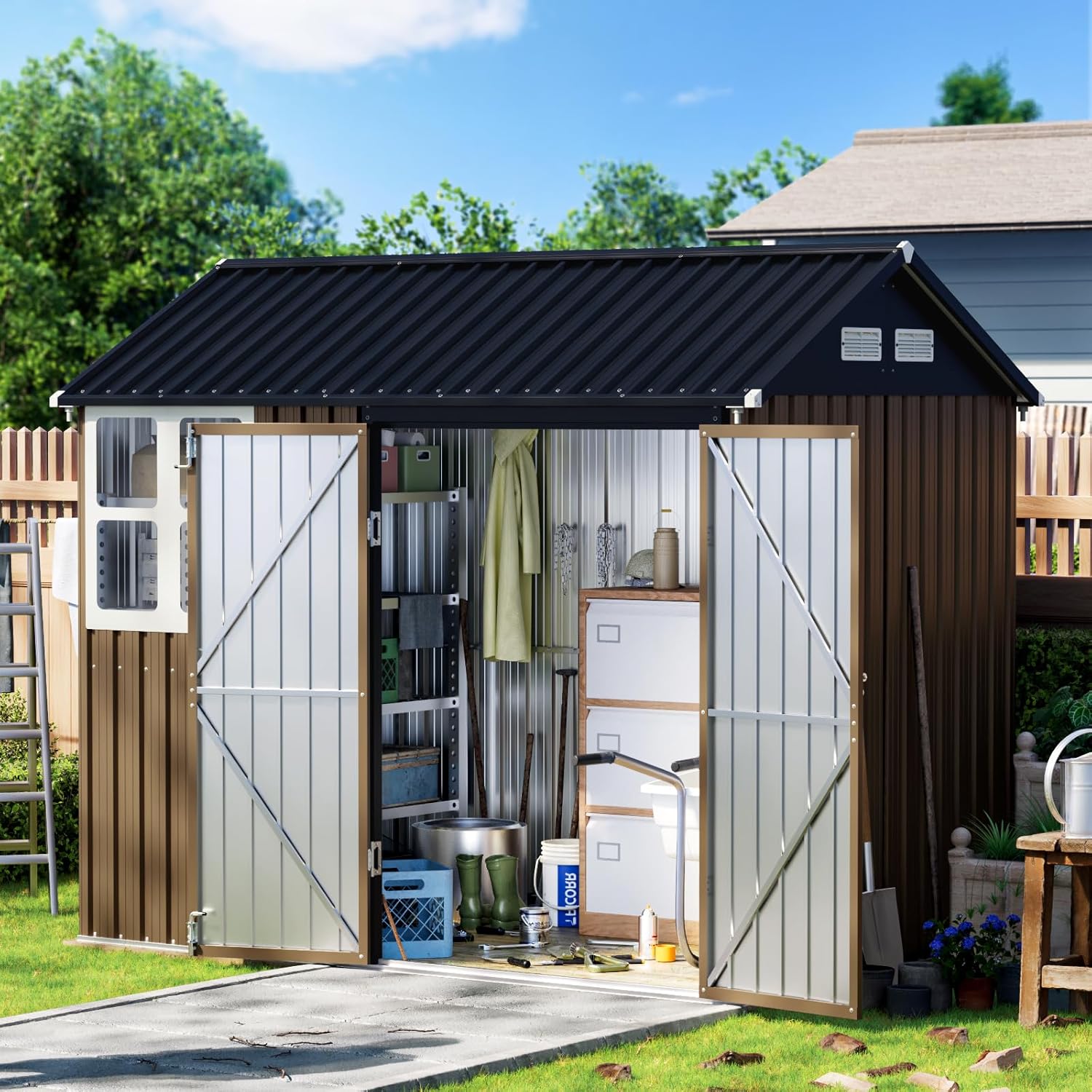 - Sturdy Metal Build: Crafted from thicker, robust metal panels, this shed provides exceptional strength and durability. Its solid construction guarantees lasting reliability and safeguards your possessions effectively.