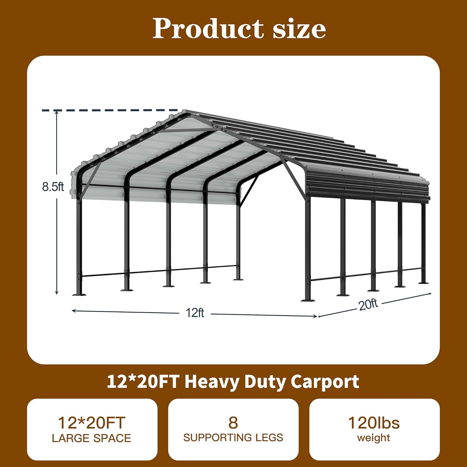 Walsunny Metal Carport 12x20 FT Heavy Duty Carport Canopy with Enhanced Base, Outdoor Car Shelter with Galvanized Steel Roof and Frame Garage for Truck, SUV, Boat, Gray