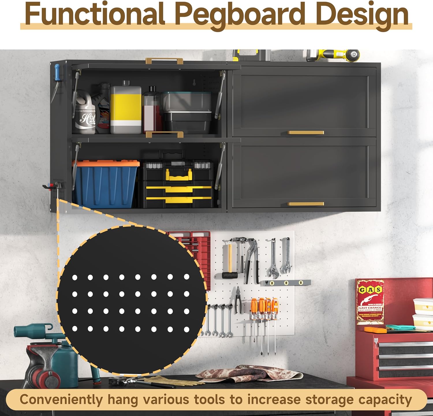 - 【MULTI-FUNCTIONAL SIDE HOLE DESIGN】Garage cabinets wall mounted whole size is : H25.6"*W27.2"*D12.6", providing a more suitable choice for orderly storage of a large number of items. Extra side Pegboard effectively increase the upper space for hanging tools, kitchen supplies, office items and more.