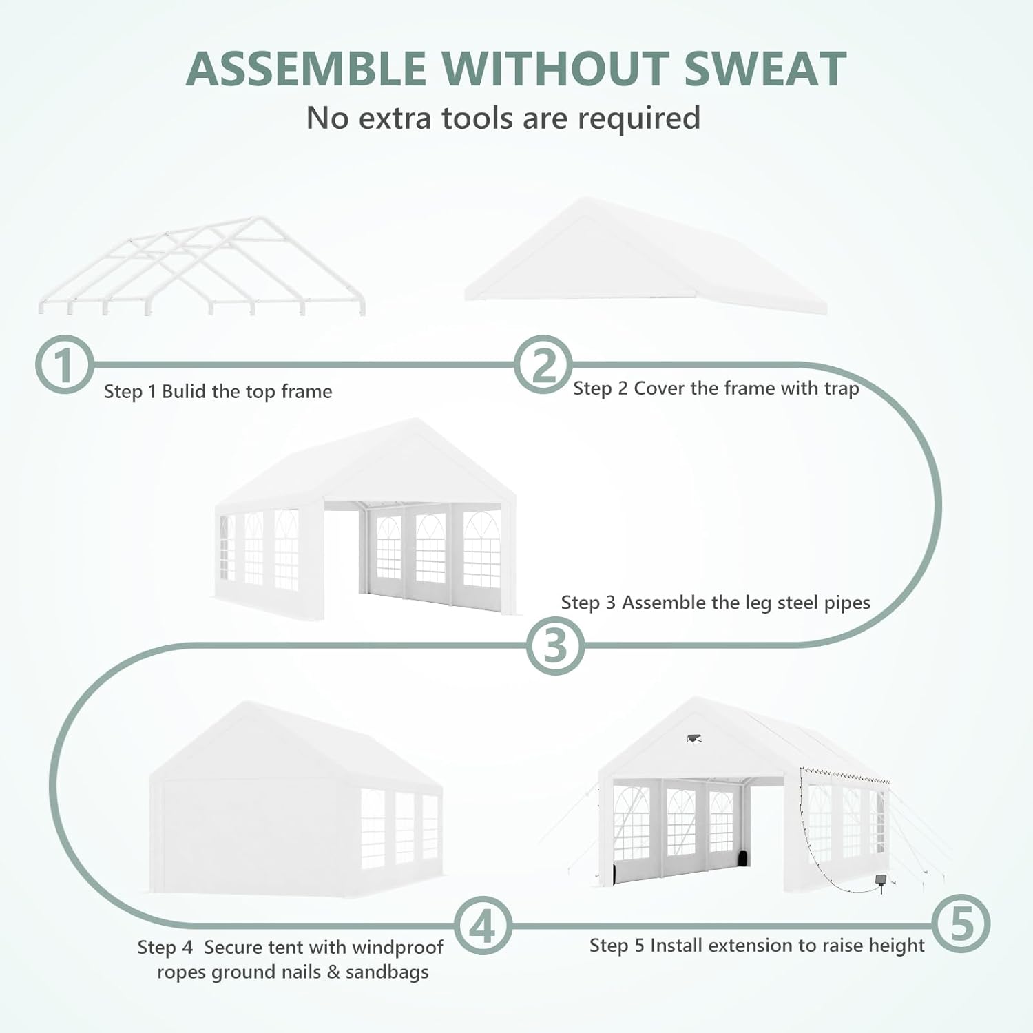- 【Versatile Use】: The carport’s removable sidewalls and doors provide a flexible layout, making it ideal for use as a carport, portable garage, car port canopy tent, boat shelter, storage shed, or party tent.