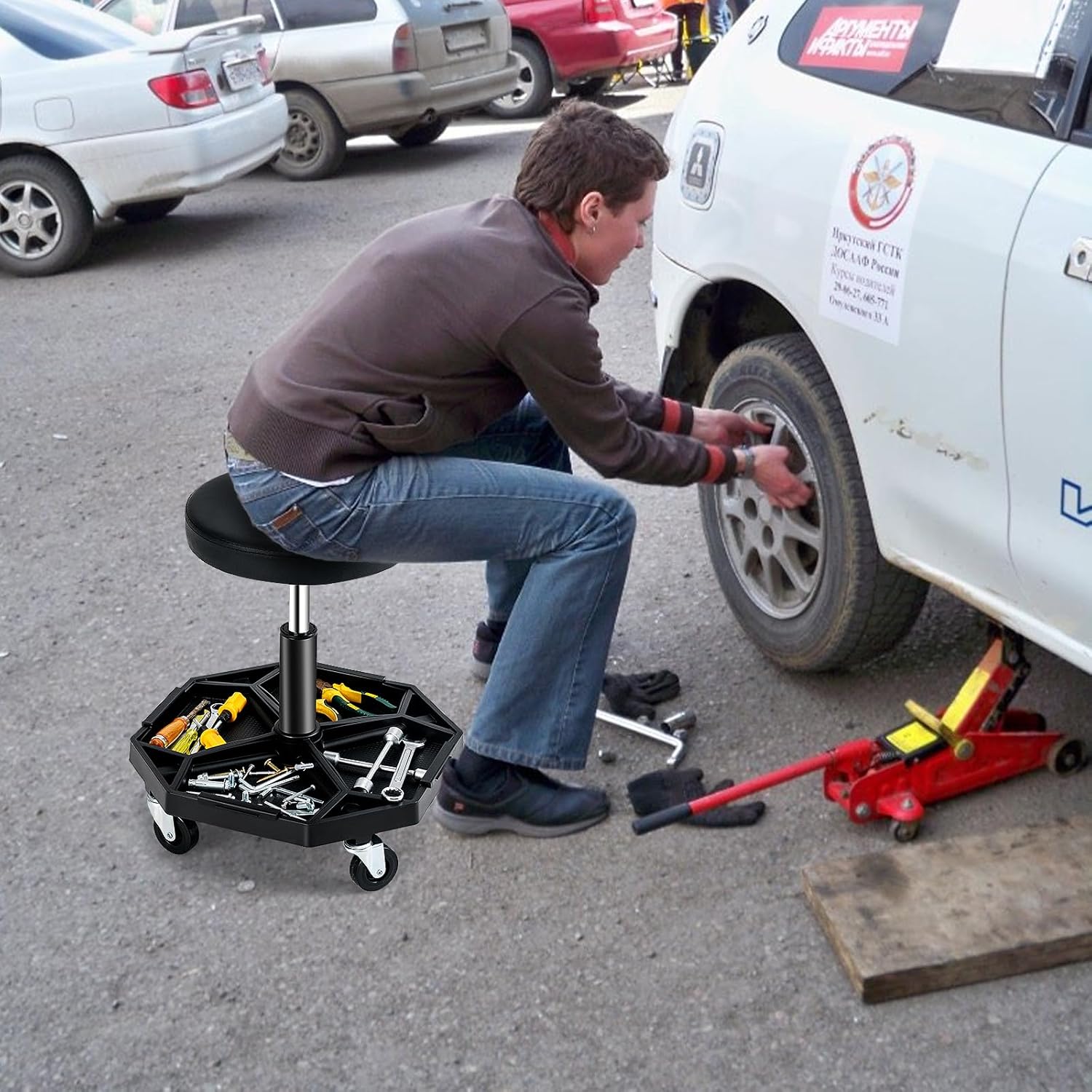 - γ Wide Usage & Easy Installation γ With a minimalist look and stylish color scheme, this versatile adjustable rolling stool can play an important role in your garage, workshop, dining area and keep your polishing, wheel washing, rubber cleaning and other tasks running smoothly. Moreover, the creeper seat is easy to install with simple steps for quick use.
