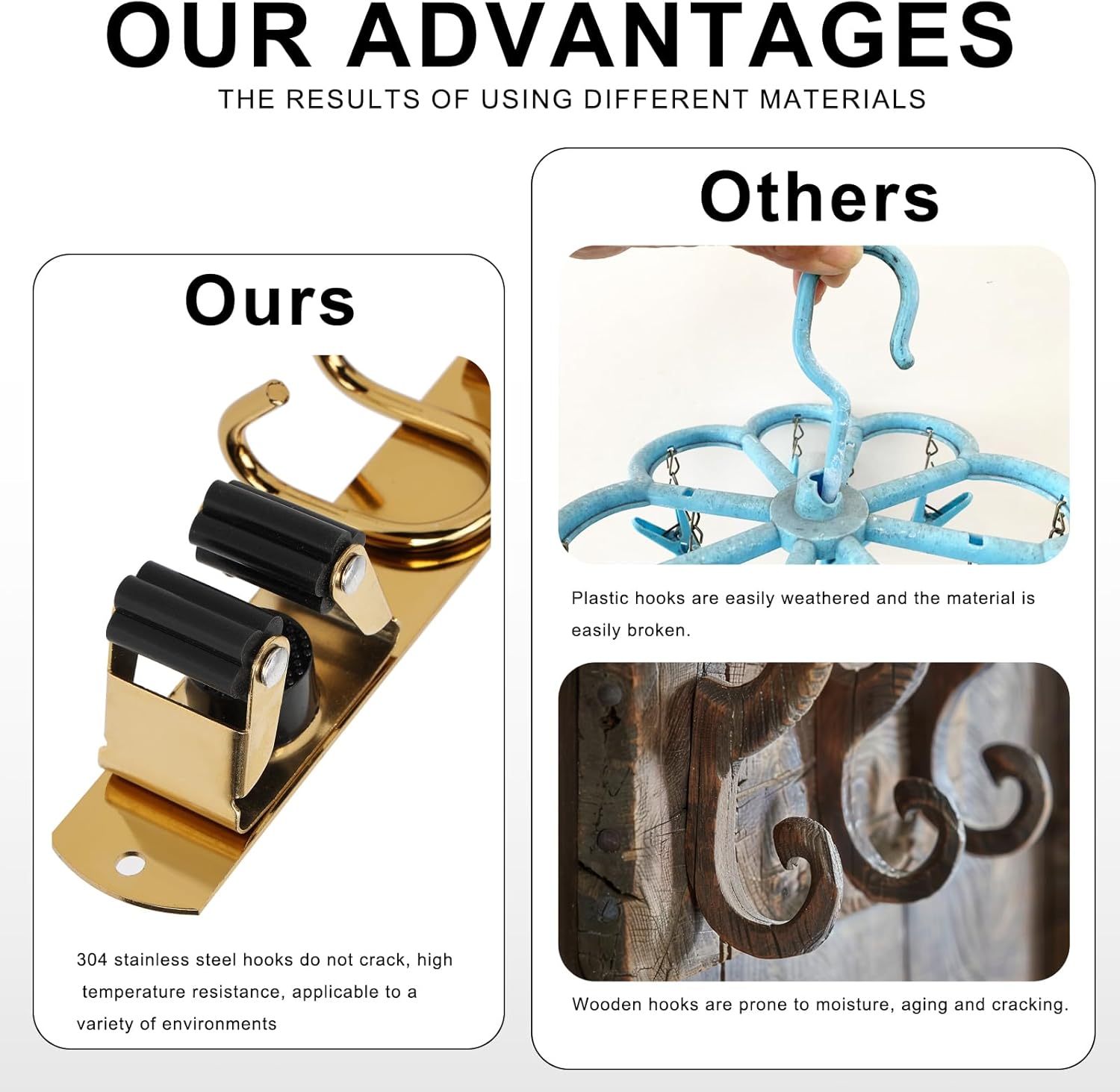 Mop Broom Holder Wall Mount, Gold Stainless Steel Tool Storage Organizer for Kitchen Garden Garage Laundry Room Bathroom and RV with 4 Slots 6 Hooks