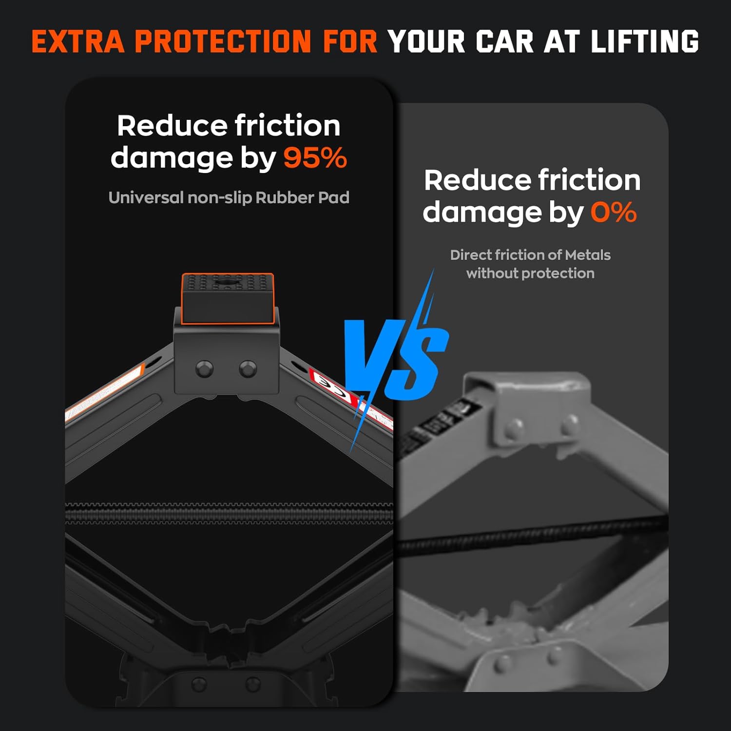 - ăReliable and Safeă This Scissor jack is Constructed with high-strength cold-rolled steel and a widened base for increased stability, our jack comes with non-slip rubber on the jack head to protect your vehicle's chassis and ensure optimal safety during lifting.